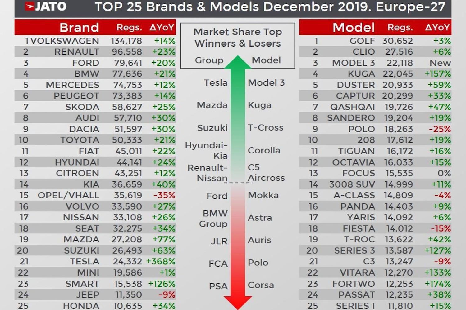 "The spike in registrations may initially look like good news, but JATO's latest data tells a different story as emission levels have not improved for the big five markets. In fact, their volume-weighted average CO2 emissions through October 2019 totalled 122.5 g/km, which is 1.2 g/km higher than the result for the whole of 2018. The December registrations are an indication of the ongoing regulatory challenges facing car makers in the year ahead," commented Felipe Munoz, JATO's global analyst.