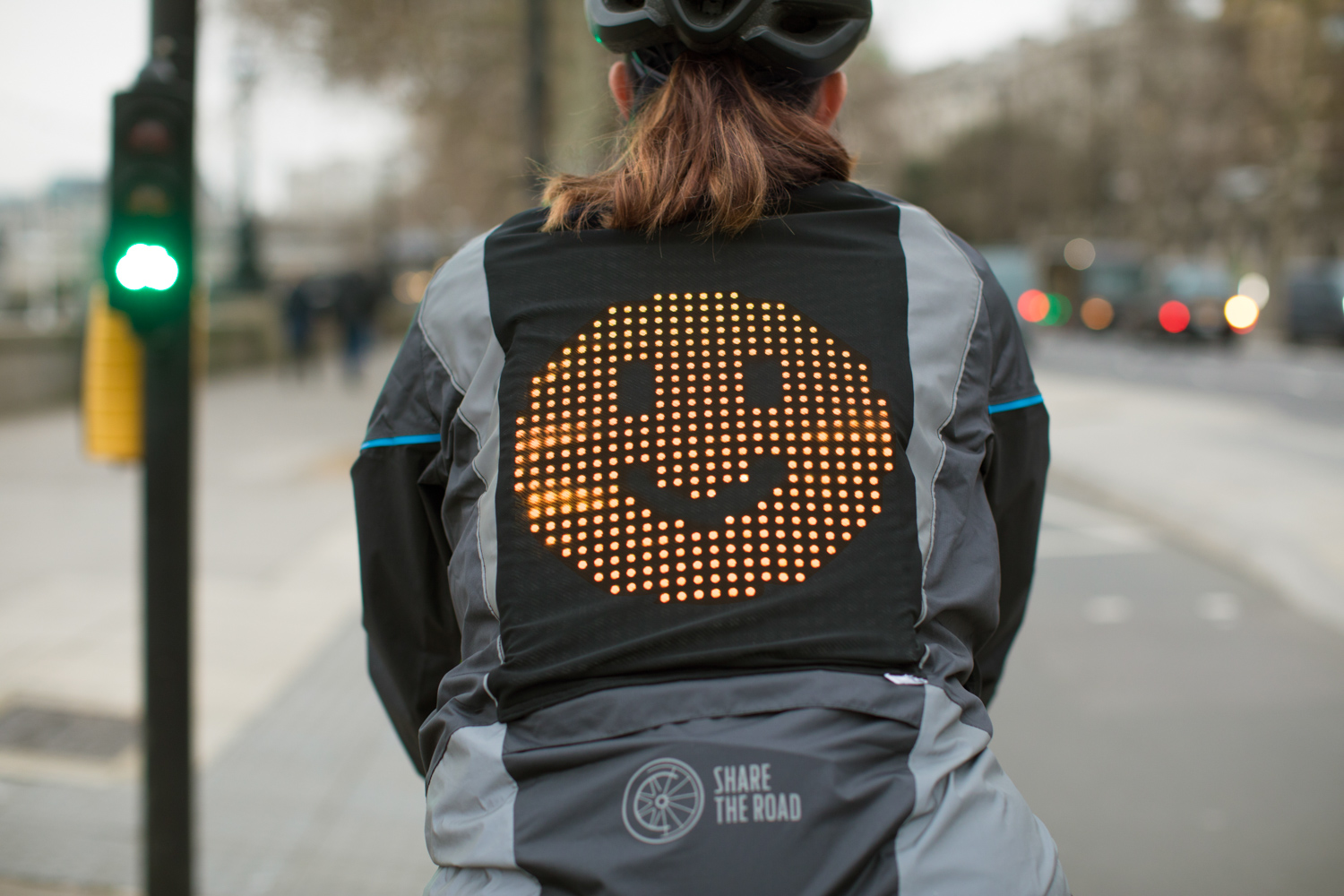 Now 20 years old, emojis (described as the first language born of the digital world) are reckoned to be an easier way for people to express their emotions than using text, or even speech. Using a handlebar-mounted pad, a cyclist can activate the display screen on the back of the jacket, and use it to display a choice of emojis - happy face, sad face, neutral face, left and right arrows, and a hazard warning triangle. Sadly you can't yet use the aubergine-head emoji, nor an extended middle finger emoji, but surely those will come in time.