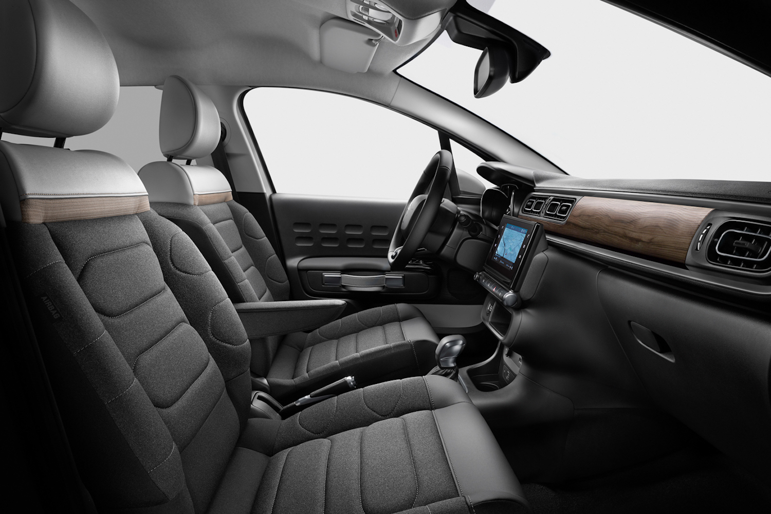 Inside, Citroen says that it's nodding at Scandinavian furniture design with the first wood veneer panels ever seen inside a small Citroen (well, since the 1930s anyway...). The idea is too create a 'cosy bubble' for the cabin occupants. Explaining the use of wood, Hélène Veilleux, Head of Colours and Materials said: "The 'Colours and Materials' team enhanced the dashboard with a wooden trim in the Scandinavian spirit, made the choice of a light upper backrest with its head rest in the same shade, which highlights the flotation line, opted for high-quality and unusual fabrics - (one technical for a dynamic colour scheme, the other more elegant - and frugal touches of colour on the inside, reminiscent of the exterior with new colours, including Emerald."