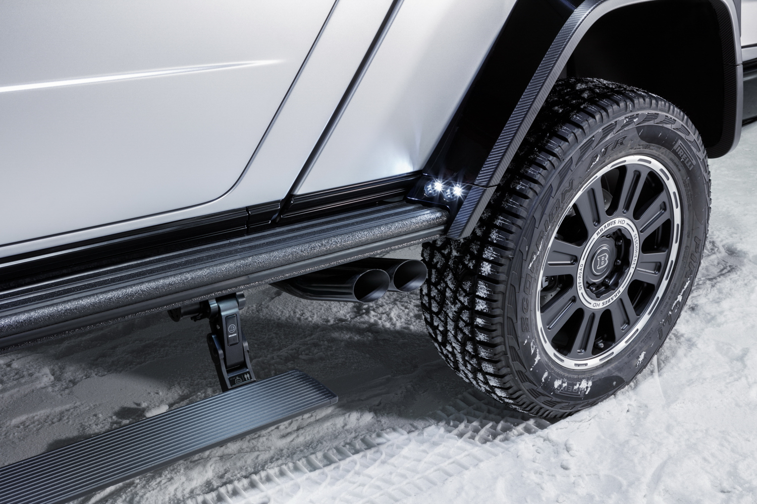 Underneath, there are massive 22-inch wheels with 325-section Pirelli Scorpion off-road tyres. These are partially covered by huge carbon wheelarch extensions, which make this Brabus car a full 11cm wider than the standard G-Wagen.