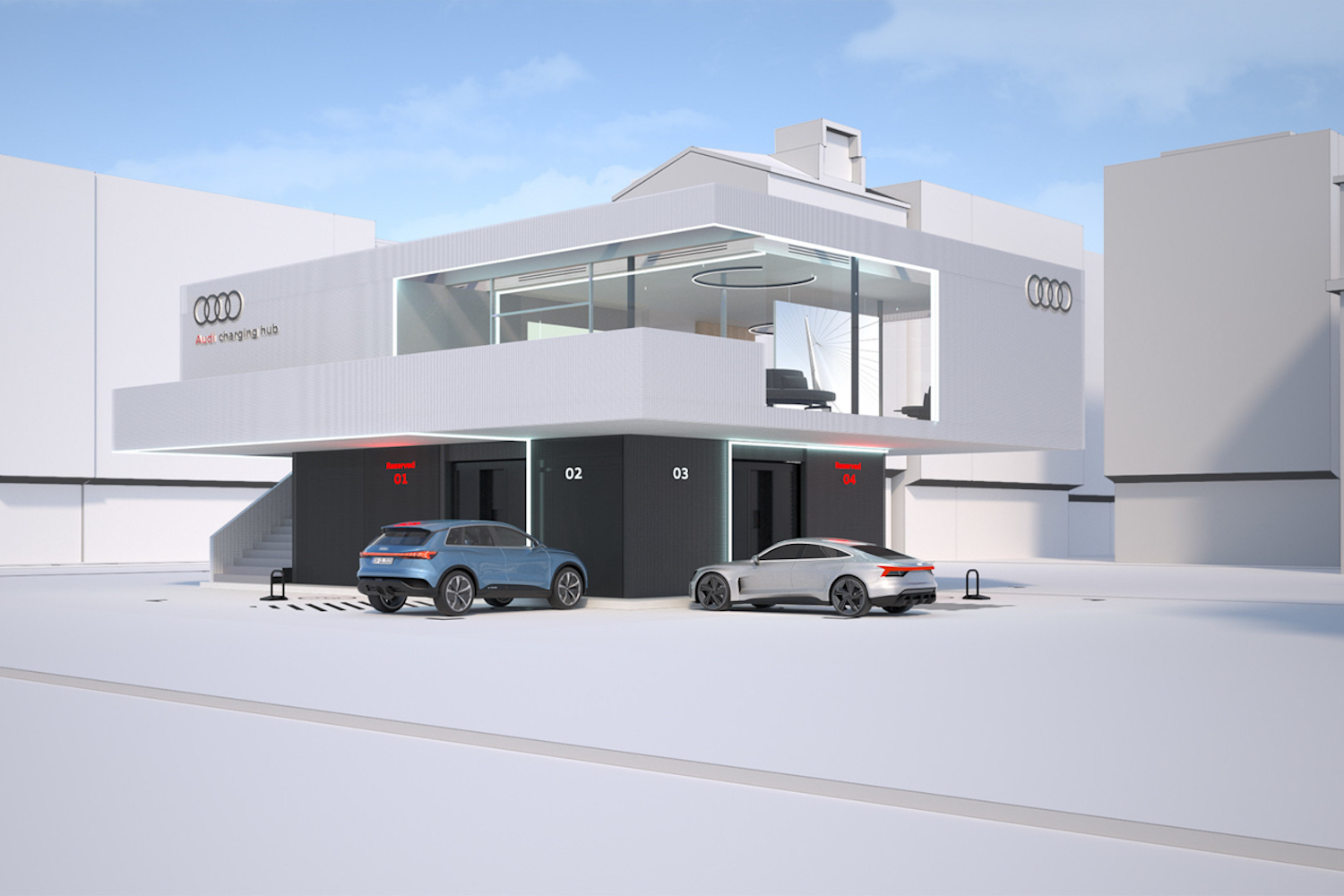 Mobile charging hub can charge multiple cars and has a luxurious waiting area.