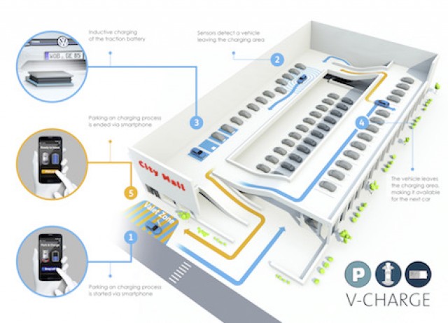 The Volkswagen V-Charge project sees cars self park and self charge.