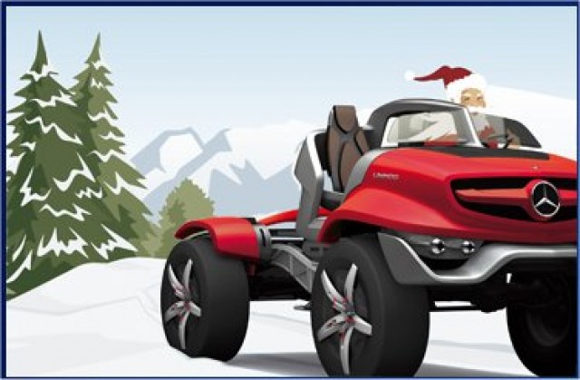 Spy shot shows Santa behind the wheel of 'Santa Red' Unimog.