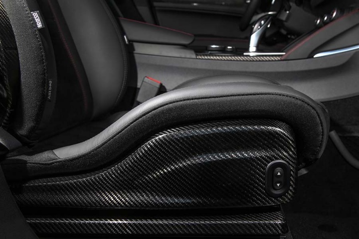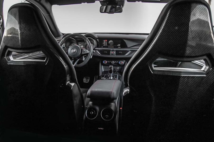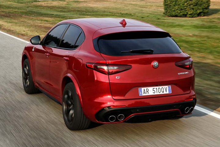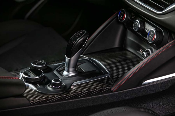 Nevertheless, the Alfa does score plenty of plus points; we like the appearance of the carbon-drenched trim and the seats are particularly lovely. Not, though, as lovely as both the gorgeous, thin-rimmed steering wheel, which is just the right girth and diameter for a performance motor, and simply exquisite metal paddle shifts, which make most other manufacturer's paddles look like the cheap, tacky plastic items that they are. It's also reasonably spacious on board for four adults and has a decent-sized boot, so you don't have to sacrifice all SUV practicality on the altar of supercar-esque performance.