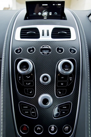 A big talking point of the new cabin is a suite of controls covering the centre stack. The pop-up satnav is now a Garmin system and the graphics and response are far better and quicker than any previous Aston Martin system. Below that is a set of capacitive switches that operate much like the latest smartphone screens - though with 'haptic' feedback in the form of a subtle vibration. They work well and add to the bespoke feel of the car. They're supplemented by a small joystick-like switch that ties it all together. Everything's made of high quality glass and metal too.