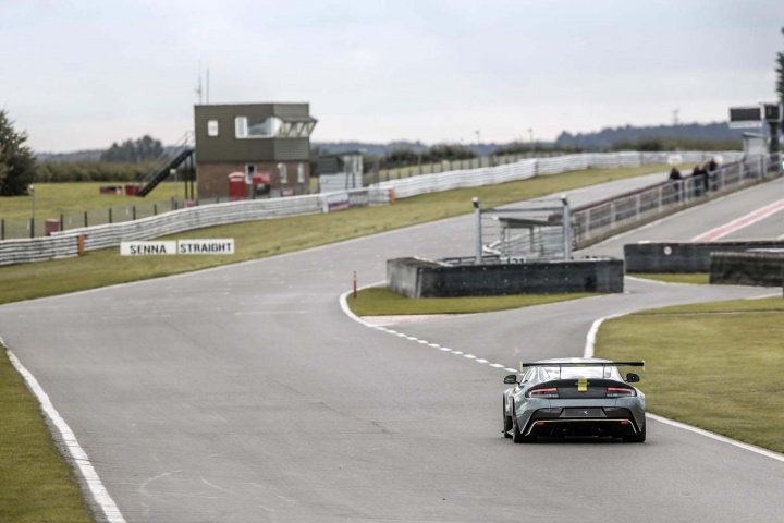 Turn one, called Riches, is fast approaching. During constant lapping it's taken wide after a hard braking zone on Senna Straight. You try your best to ignore the visible first apex and instead set the car up for the second. By the end of the day, I manage to get through this in fourth gear, leaving the car ease to the outside and grabbing fifth briefly before standing on the brakes again for the fiendishly tight Wilson chicane. The Vantage is exceptional under braking. There's plenty of aerodynamic downforce in play at these speeds, but the development team tried hard to reduce pitch sensitivity, so when you do brake from high speed, there's little or no instability from the rear end, giving you confidence to really push on. After being patient with the throttle through the chicane, you can really feel the mechanical limited slip differential working as you ease the power back in, giving the car a deliciously rear-led stance onto the Bentley Straight. The traction control is on by default, but there's a well-judged mid-setting that's fantastic for those learning the car or circuit, allowing plenty of slip, but keeping things neat. No doubt owners will soon switch if off. I also suspect that some will look into fitting fully slick tyres to maximise the aerodynamics on offer. Saying that, the Michelin Pilot Cup 2s lasted well all day and gave back consistent grip without overheating in each of the five-lap stints we carried out.
