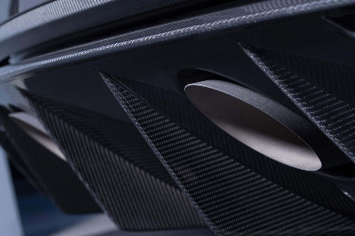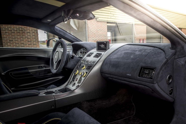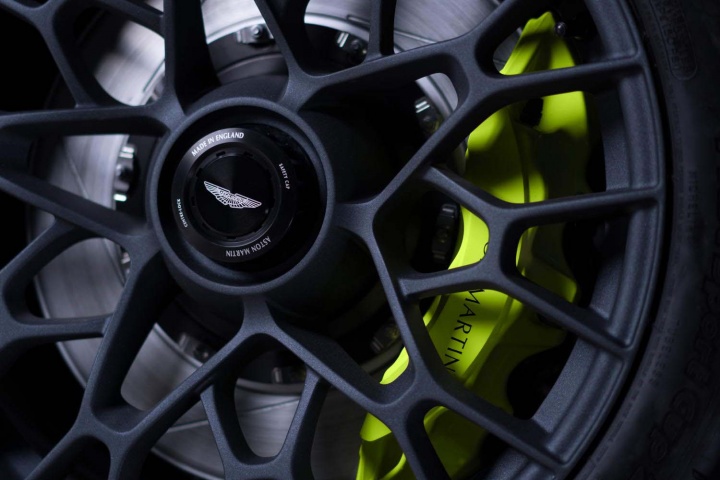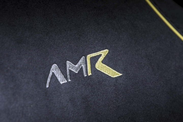 More lime green detailing can be found inside the AMR Pro Vantage, but it's not the stripped-back racing cabin you might be expecting. Even the infotainment screen and controller have been carried over from the production car intact. There's plenty of carbon fibre detailing, however, and gorgeous 'Dark Knight' Alcantara, plus two lightweight bucket seats. Look closer and you'll find a very neat custom roll cage designed by 'Q by Aston Martin' and if buyers want they can have full-on six-point race harnesses.