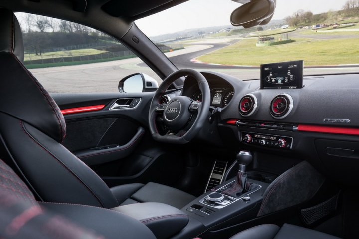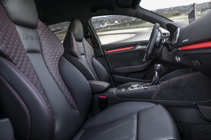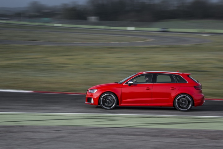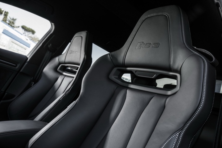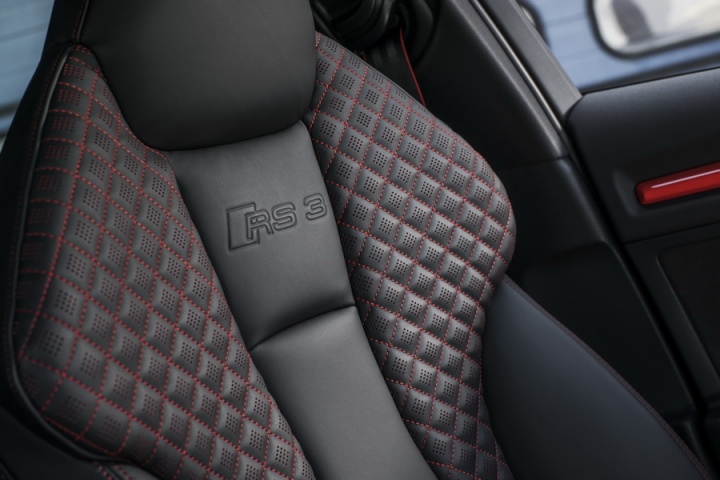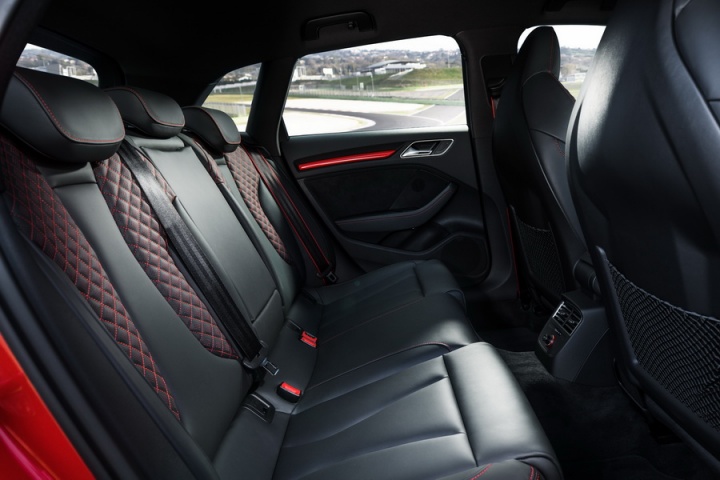 The interior follows the RS recipe to the letter, too. There's a flat-bottomed steering wheel with RS 3 badging, RS 3 instruments and a smattering of Alcantara. Pay extra for the lightweight bucket seats if you're planning on taking it to a track, though the standard seats hold you in tightly enough on the road - and are easier to get in and out of. The A3 felt pretty special inside before the RS people got their hands on it, so the changes only add to that, without detracting from its day-to-day usability or practicality.