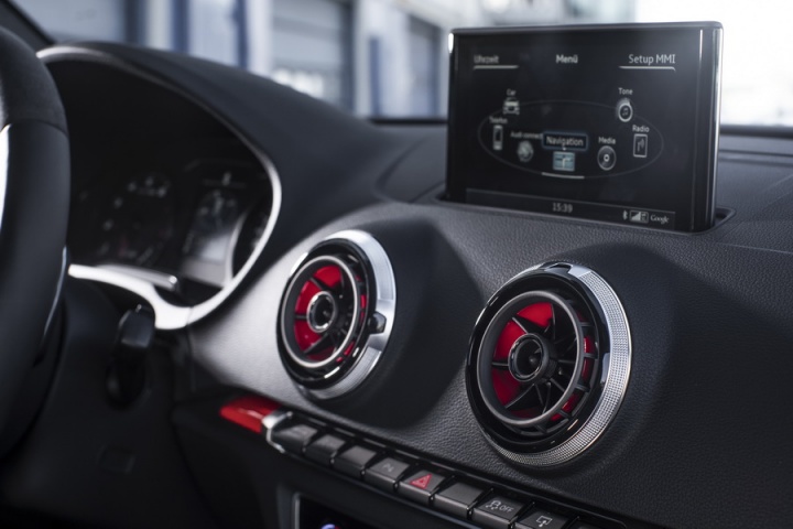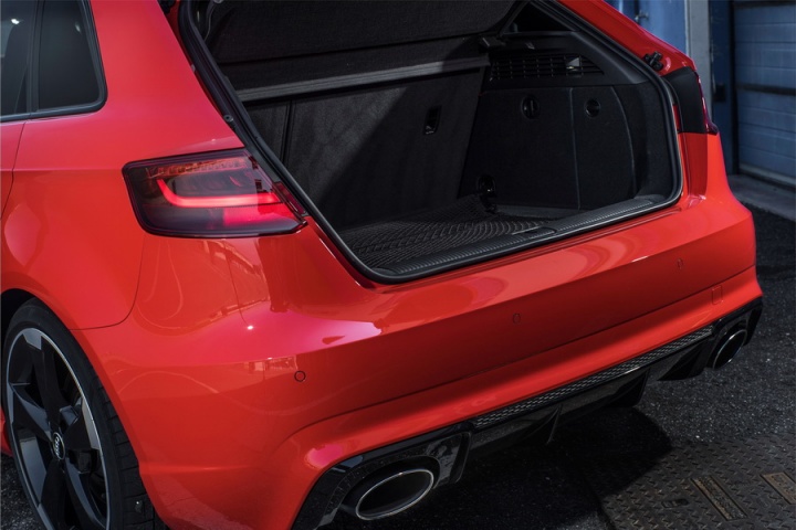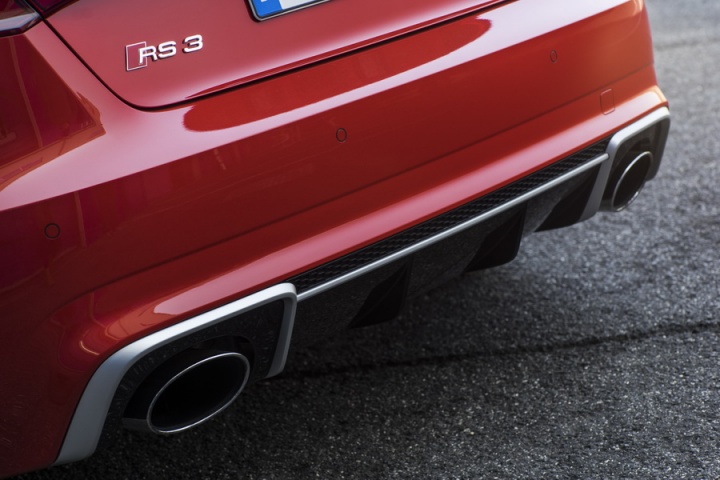 Subtle changes mark Audi's fastest five-door hatch out (ignoring the RS 7), the RS 3 gaining the usual RS signifiers such as deeper air intakes, brushed metal highlights, large alloy wheels and a pair of gargantuan tailpipes. It's an effective makeover, the handsome lines of the standard Audi A3 given a convincing sporting boost by the company's performance off-shoot, quattro GmbH. The wheel arches are slightly enlarged, though unlike its predecessor those front wings are made of metal rather than carbon fibre. Remove the RS 3 badges and have those brushed metal accents changed via the options list and the RS 3 could be mistaken for just another Audi A3 S line.