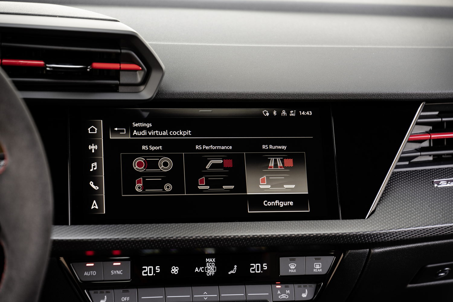A redo of the 'virtual cockpit plus' 12.3-inch digital instrument display adds RS-specific readouts and drivers can have a raft of parameters on show, from a G-meter to blinking shift light indicator. When you aren't using the 10.1-inch touchscreen for your Apple CarPlay or Android Auto, you can view the coolant and gearbox oil temperatures or delve into the numerous setup options available.