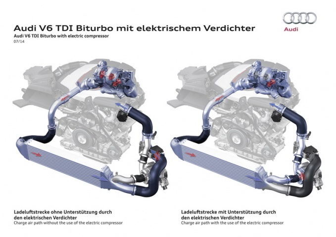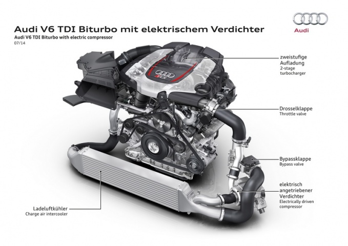 So what exactly is it? Audi has taken its already impressive 3.0-litre diesel V6 biturbo engine and equipped it with an electric compressor - or e-booster as it prefers to call it - which optimises the performance of the turbochargers thus improving overall performance. The compressor sits downstream of the intercooler so at very low engine speeds, which also means lower exhaust gases being routed to a traditional turbocharger, a bypass valve closes, routing the air to the e-booster. As the compressor is driven electrically, it can produce a rapid build-up of boost pressure, which is directed to the engine's smaller turbocharger, enabling it to spool up far quicker than were it to rely solely on exhaust gas. The result is the effective elimination of turbo lag and the ability to produce peak torque of 750Nm between 1,250- and 2,000rpm.