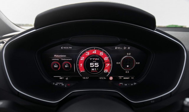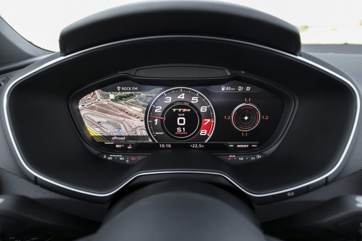 The changes follow that sporting theme inside as well. Deeper seats with body-hugging bolstering, a shapely steering wheel borrowed from the Audi R8 and an extra RS display in Audi's 'Virtual Cockpit' instruments headline the changes. That wheel's got a big starter button on it, as well as controls for the Drive Select system, helping the TT RS's cabin be uncluttered visually, though operationally it can prove a little bit fussy at first. Spend some time selecting your instrumentation and supplementary info and entertainment before you head off then, though it's no hardship sitting with the engine idling with a hugely appealing bass-rich off-beat five-cylinder thrum for accompaniment.