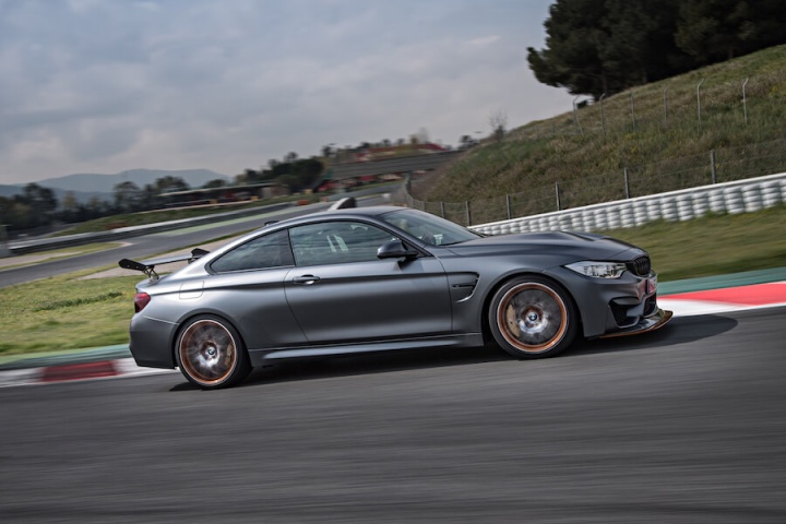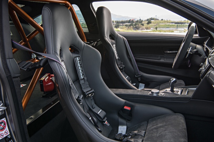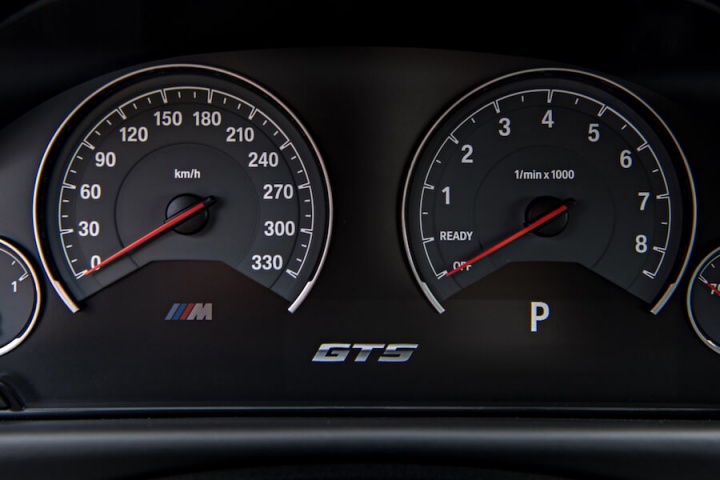 Given M's intent for this car, it's hardly surprising that our first drive is exclusively limited to a track. Specifically, the Circuit de Catalunya, 4.65km and 16 corners of bumpy Spanish circuit. Buckling into a car with six-point seatbelts always ups the anticipation, though be sure to close the doors via those simple straps before tightening the belts or you'll be loosening them off again quickly. Though more overtly track-focused than the regular BMW M4, thanks in large to the bucket seats, that (free) optional cage and no back seats, the cabin is still familiar. There's a GTS badge on the dash if you've somehow forgotten that this isn't an ordinary M4, though thumbing the engine start button leaves you with no doubt.