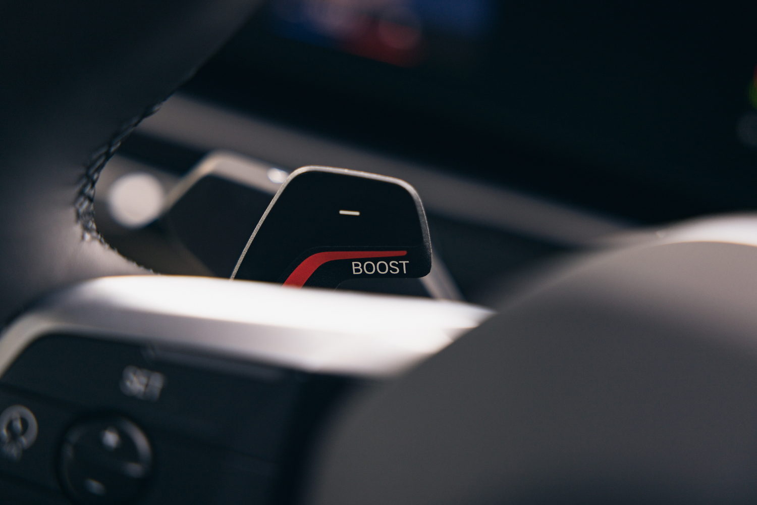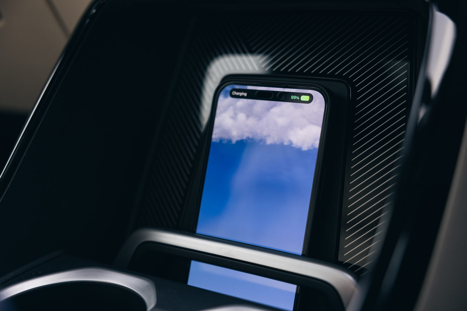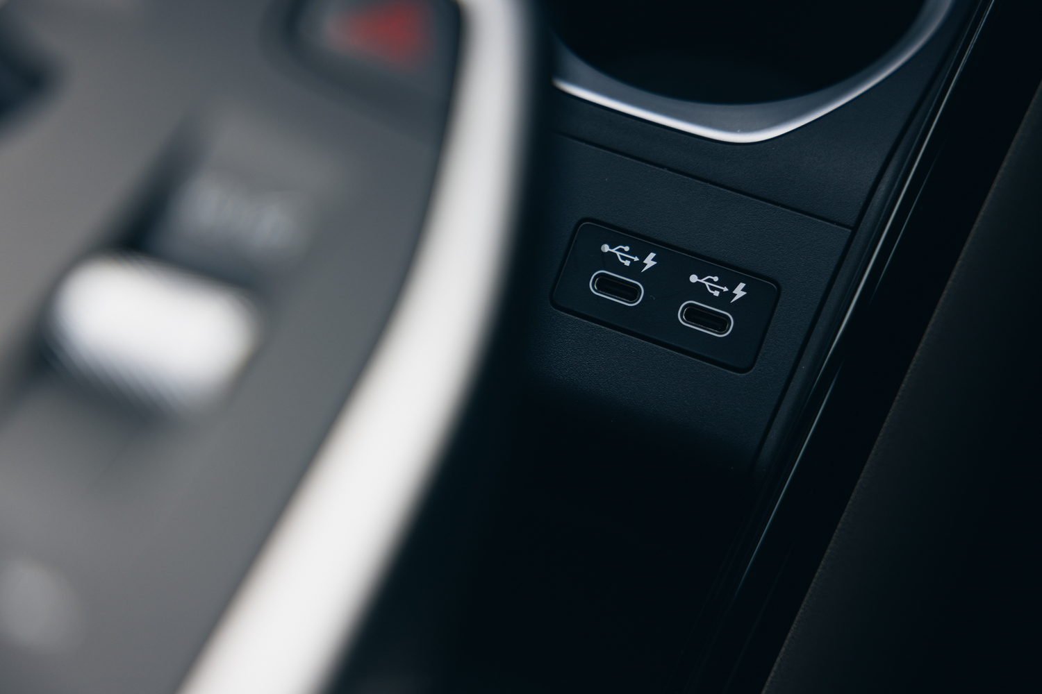 Behind these is a very shallow lidded tray, which annoyingly is hinged on the wrong side for right-hand drive, and which along with the decently-sized glovebox is the only covered storage in the cabin. Ahead of the floating centre console there's a pair of cupholders, two USB-C sockets and an upright wireless phone charging pad with a little physical clip that holds your phone in place. There are also well-sized door bins, and the bottle holders in those are capable of taking chunky drinks bottles.