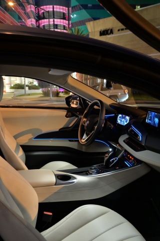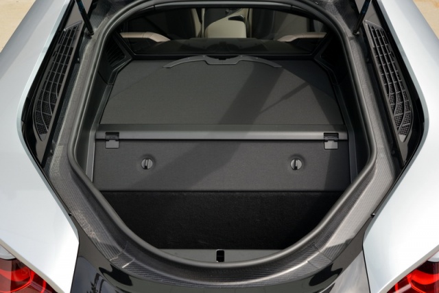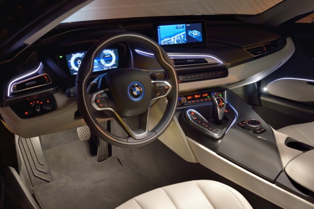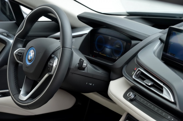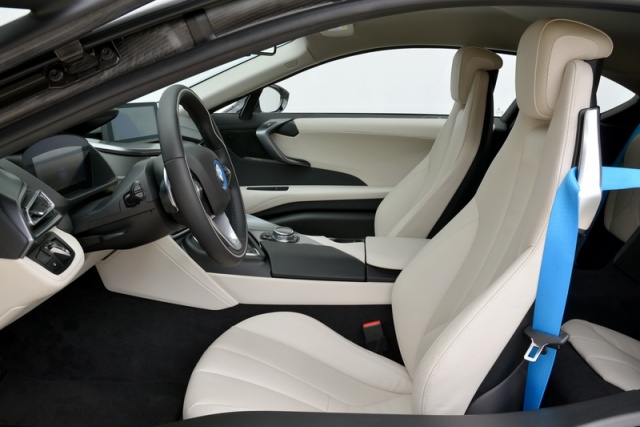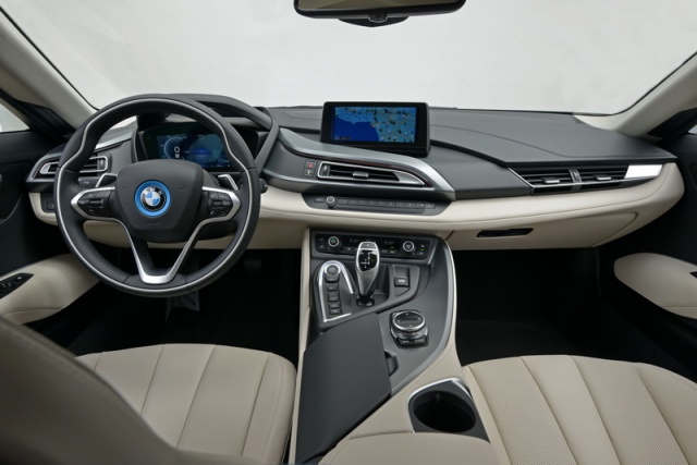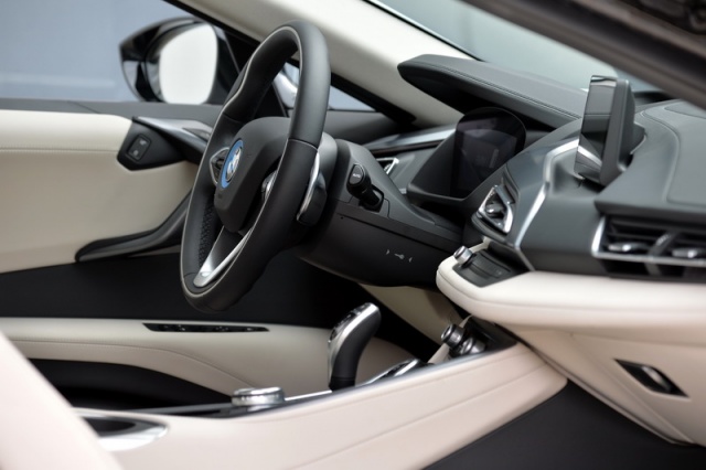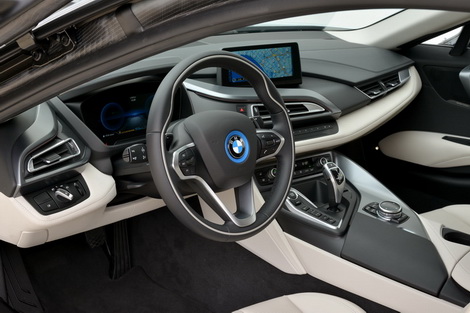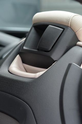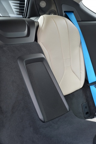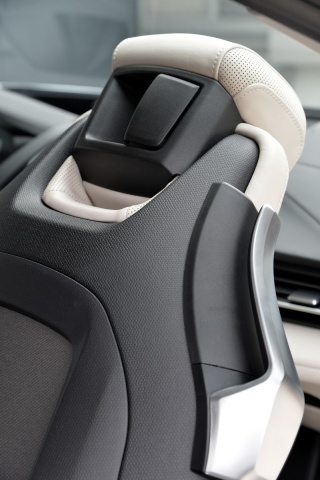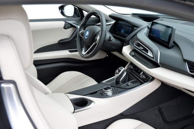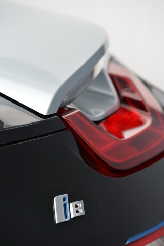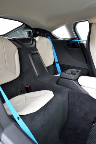 The interior echoes that exterior future BMW look with a twist. The layered, driver-focused dashboard creates a real cockpit feel, the deep central transmission tunnel - housing the i8's lithium-ion batteries - and bare carbon fibre jams around the door shamelessly reveal the i8's lightweight construction. As if needed, more theatre is involved in getting into the i8 by winged doors, hinged on the A-pillar and opening up and away from you. Instrumentation is courtesy of a pair of screens, displaying - not always particularly clearly - the usual information mixed with the state of the various hybrid systems and power flow. A 2+2, the rear seats are best considered as additional luggage space, particularly as the tiny and poorly accessed boot offers little useful space - and it gets hot thanks to the proximity of the engine.