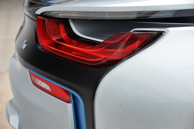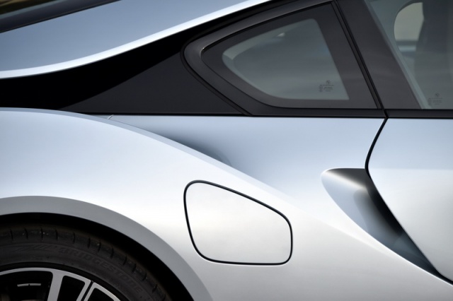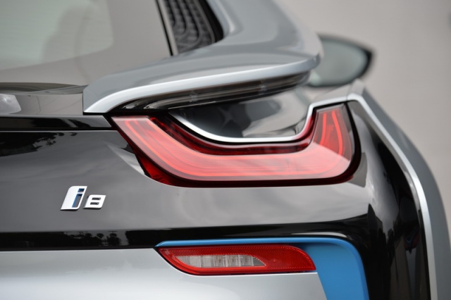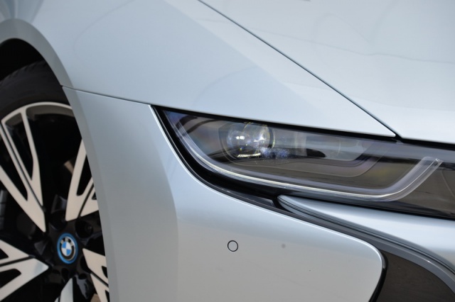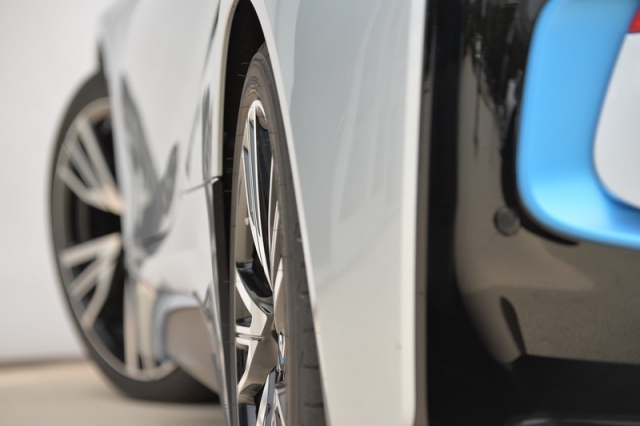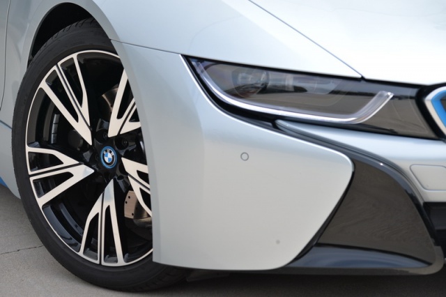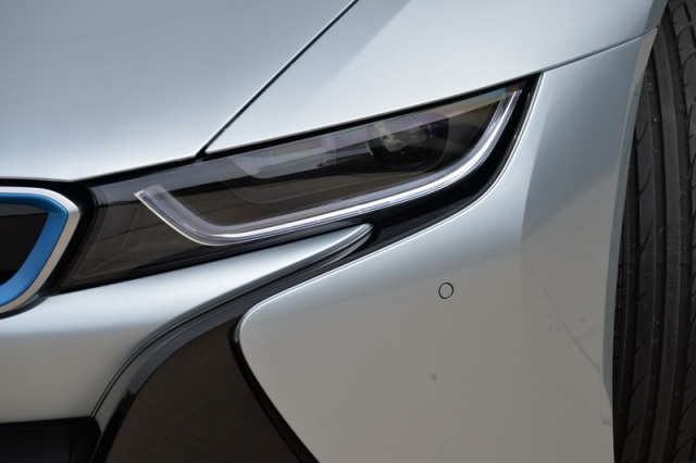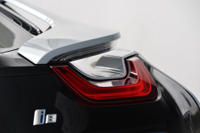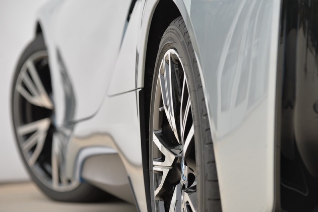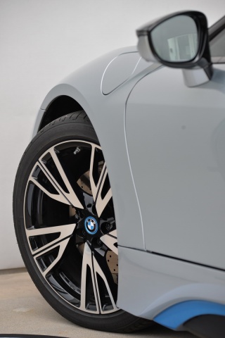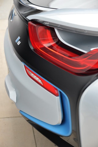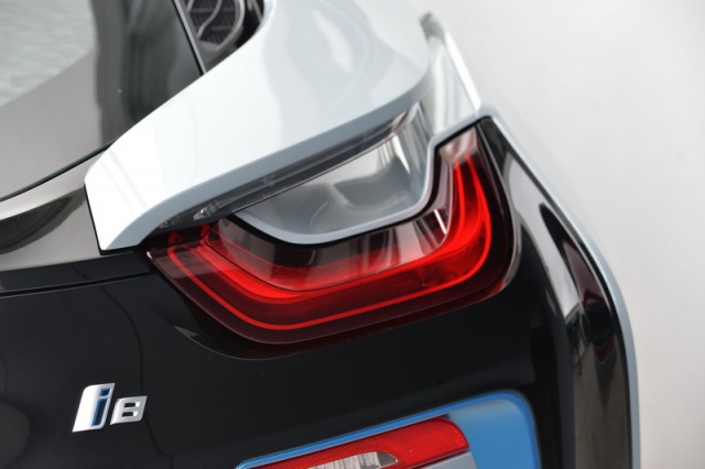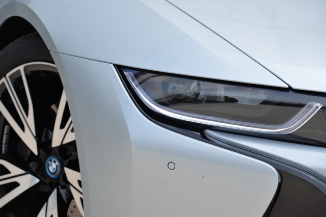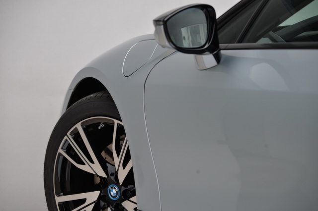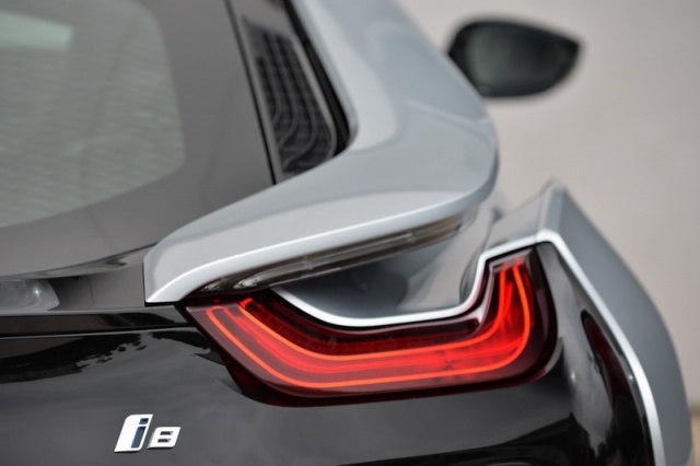 Carbon re-enforced plastics, not metal to be precise, as the BMW i8's body, like the structure underneath, is extensively constructed of the lightweight, strong material. Visually it's stunning, a riot of complex surface treatments, that are both functional and beautiful in equal measure. BMW's faithfulness to the original concept car's lines is very impressive indeed. Contrasting body colours highlight its form, the sharp creases, scalloped sills and floating teardrop roofline not only creating one of the most traffic-stopping designs we've driven since the first Audi TT hit the roads, but it's also wind-tunnel honed for maximum efficiency.