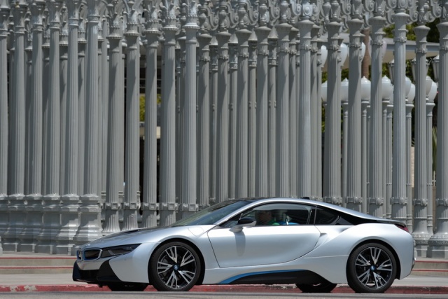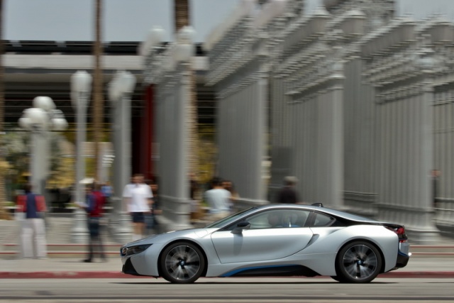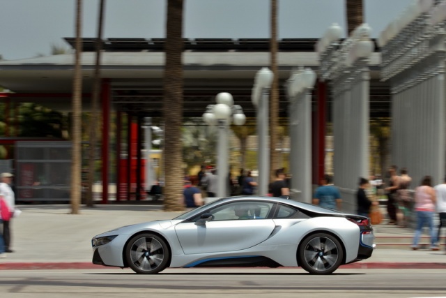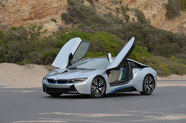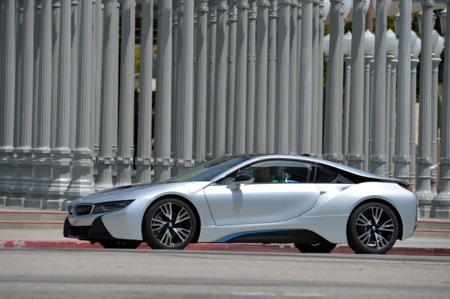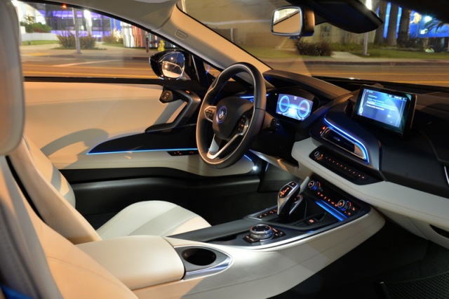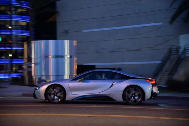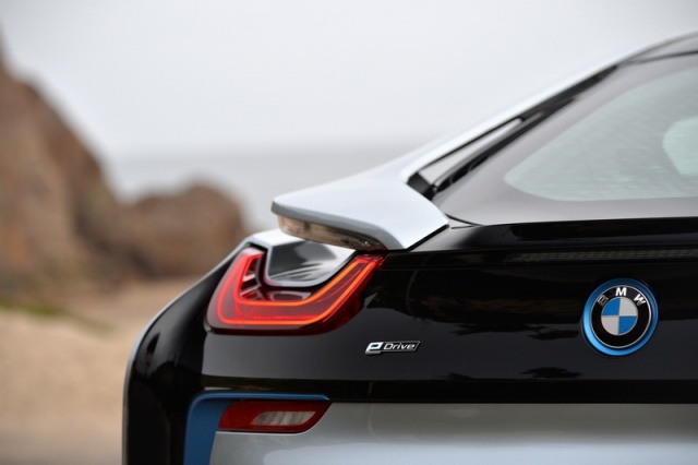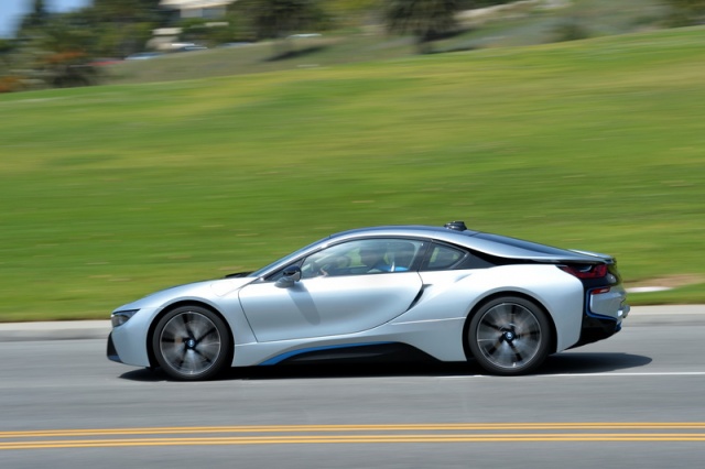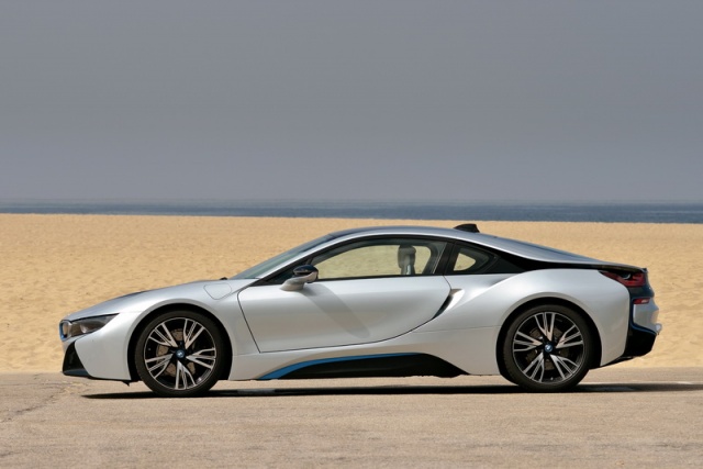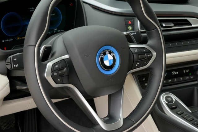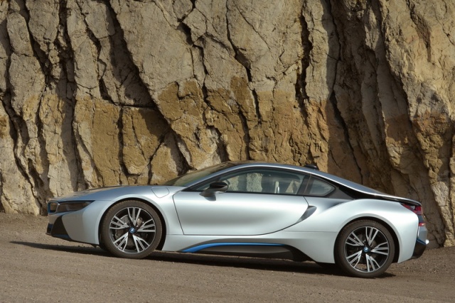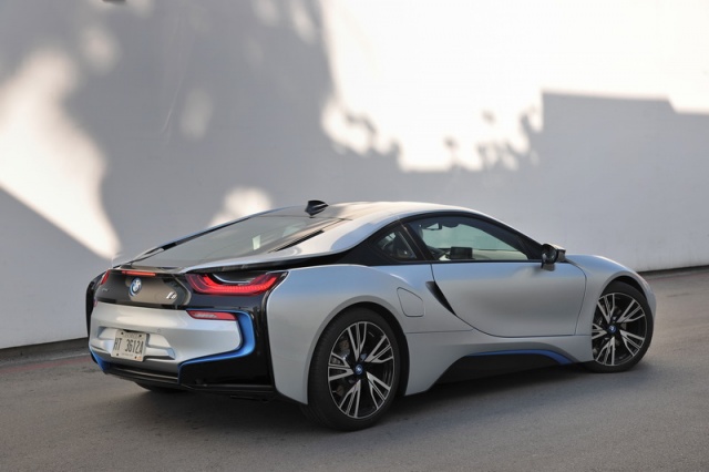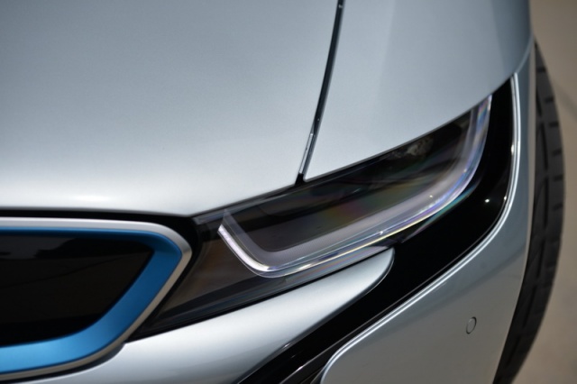 Carbon re-enforced plastics, not metal to be precise, as the BMW i8's body, like the structure underneath, is extensively constructed of the lightweight, strong material. Visually it's stunning, a riot of complex surface treatments, that are both functional and beautiful in equal measure. BMW's faithfulness to the original concept car's lines is very impressive indeed. Contrasting body colours highlight its form, the sharp creases, scalloped sills and floating teardrop roofline not only creating one of the most traffic-stopping designs we've driven since the first Audi TT hit the roads, but it's also wind-tunnel honed for maximum efficiency.