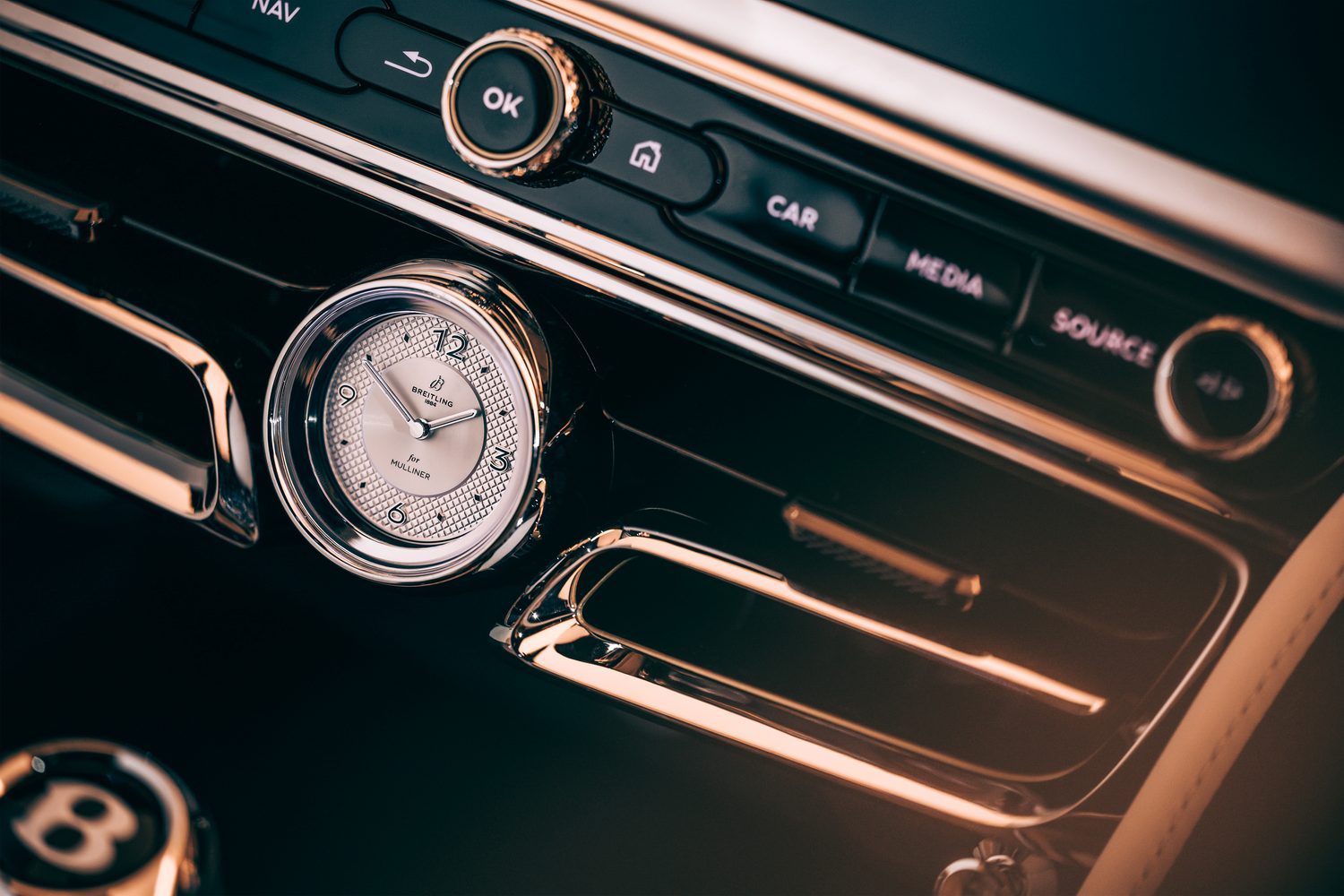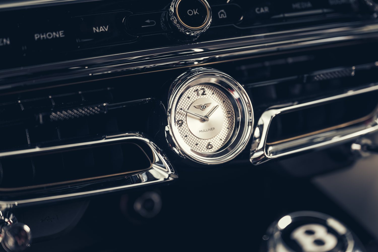 The Mulliner model is denoted on the outside by its exclusive 22-inch alloy wheels with self-levelling centre caps, the ‘Double Diamond’ front grilles, Satin Silver-painted door-mirror housings, jewelled caps for the fuel and oil fillers (the latter hidden under the bonnet, obviously), discreet Mulliner badging on the wing vents, and a Flying B emblem which electronically deploys and which is illuminated at night.