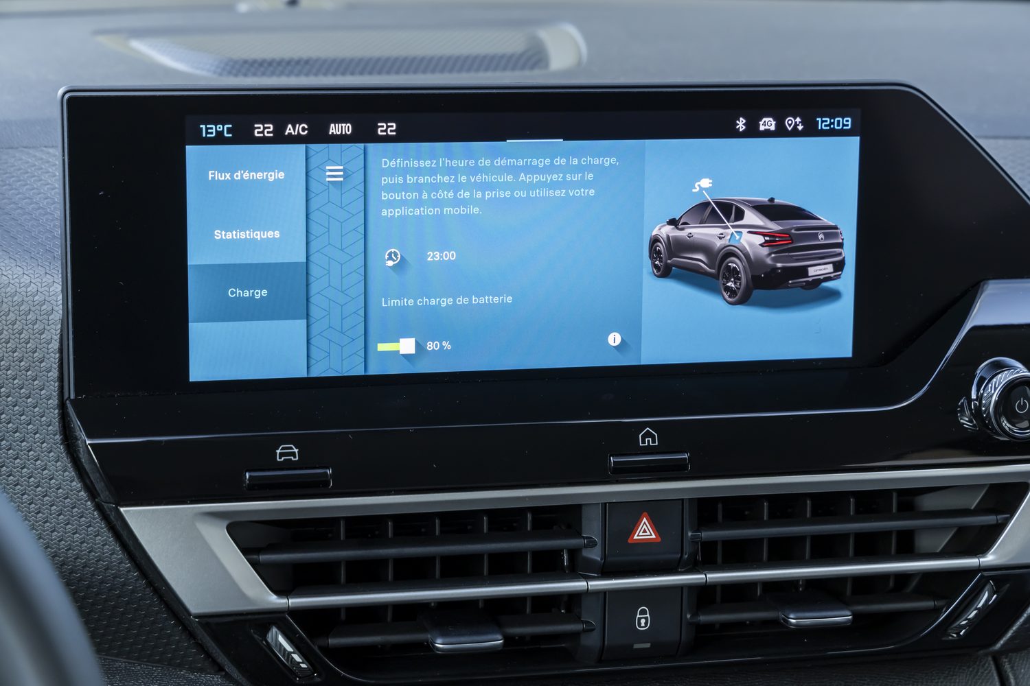 Obviously, the forward cabin is shared with the C4, but the rear part of the cabin is not. There’s a bit more space in the back of the e-C4 X than in the comparable C4 models, with slightly more legroom and headroom, thanks to the different roofline. The e-C4 is comfortable enough for four, but the e-C4 X is that fraction more commodious for taller rear-seat passengers.