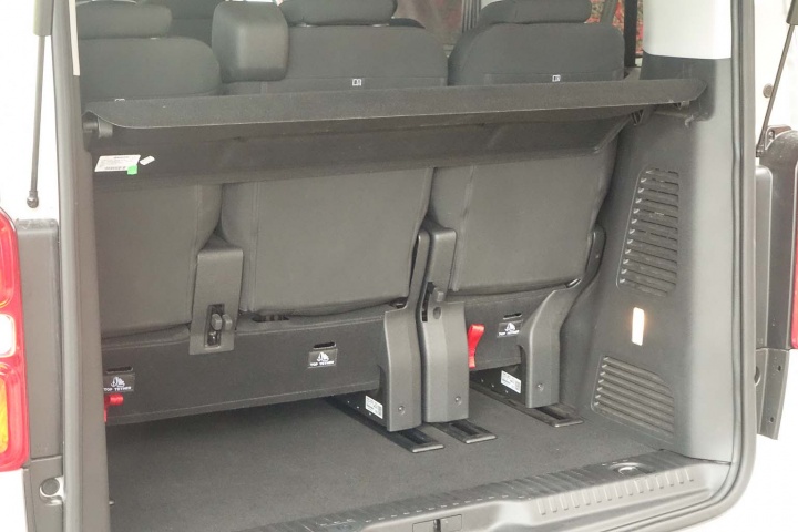 Obviously boot space isn't massive when all eight seats are in use, but it exists, and there's lots of storage elsewhere in the cabin, especially in the front with several large covered stowage boxes and other useful details like the extra rear-view mirror to watch rear passengers, plenty of 12-volt power sockets, separate climate control switches for the rear, a torch built into the side of the boot and an alcove under the stereo in which you can put your phone while it's plugged into the USB port. Connect a smartphone to that and you can avail of the CarPlay or MirrorLink functionality and our car even featured decent touchscreen satnav.