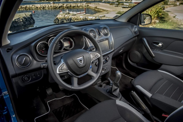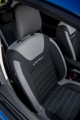 Stepway-specific graphics are included on the front doors just below the mirrors and emblazoned on the new seats with their 'dark carbon' patterned cloth, although once you're sat in those (and thus are obscuring both the logo and the pattern), the only giveaway to its Sandero-plus leanings is the blue 'Stepway' emblem just below the new steering wheel's centre boss. It certainly doesn't feel taller from behind said four-spoke wheel than a normal Sandero and there's a dearth of earthy, mud trail-type interior detailing to make it feel any more special than the regular hatch. Which means, as we head out on the roads to test drive the refreshed version, we're less than convinced of the Stepway's merits over and above a Sandero...