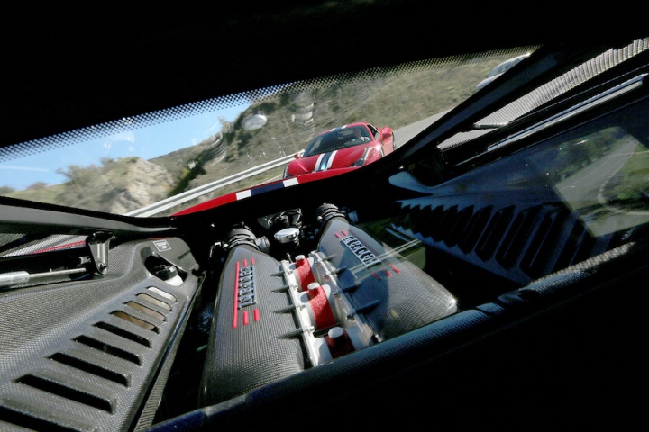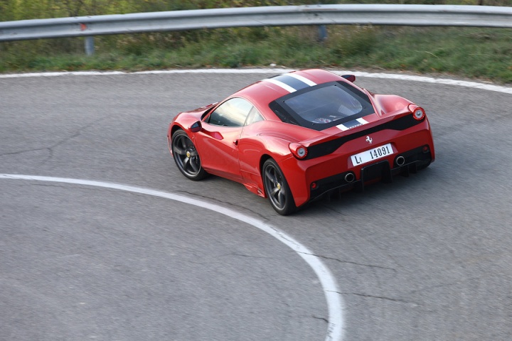 But you do get the feeling that you're keeping the engine reined in, and once the road opens up and you get a chance to push the long-travel throttle pedal with any real conviction it's clear that this car has the ability to redefine your idea of 'fast'. The bare numbers in the tech specs tell some of the story, but the fury with which this car accelerates is, at times, uncomfortable for us mere mortals. Especially within the confines of a public road and speed limits. It takes seconds to broach those limits. But perhaps more life-changing than the rate of acceleration is the noise the Ferrari V8 engine makes. I challenge anyone to experience it and not have an emotional response. Small children and dogs (and some grown men no doubt) will whimper and cry on hearing the 458 Speciale at full chat, while others (me included) will laugh out loud, giggle and holler with delight. At low revs it's more functional than interesting to listen to, but in the mid-range it starts to get purposeful and as you approach the redline (at 9,000rpm no less) it's shrieking as loudly and as evocatively as many a motorsport machine. And then you grab the right hand paddle to summon up the next gear in the seven-speed transmission and it does it all again.