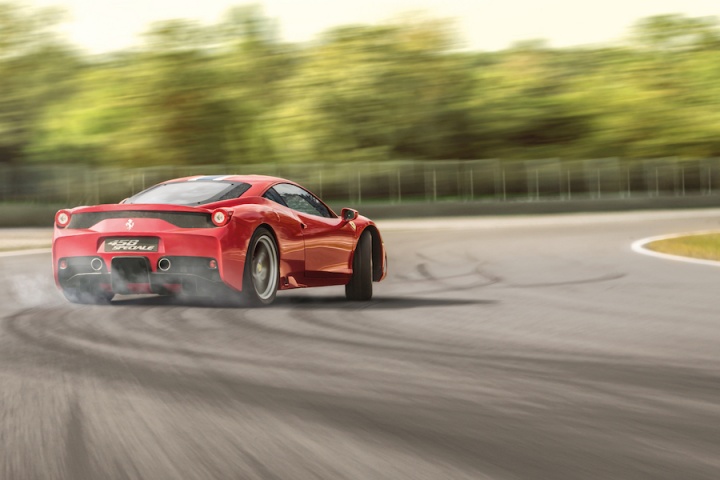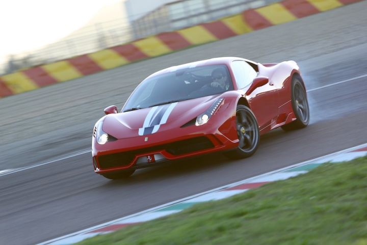 For a life-long car nut it doesn't get much better than this. Most of us would be happy to experience this car driven in a strange line up and down all day, but that would be to miss out on the 458 Speciale's rather sublime chassis talents. It features Frequency-Shaped SCM-E dampers for a start, which alter the viscosity of their damping fluid every millisecond depending on conditions, helping the car deal with all kinds of road surface. They work too, as we discovered on a wide range of different roads in the UK. The 458 Speciale is Lotus-like in the way it seems to fluidly move with the topography underneath rather than constantly fidget and fight it. Sure it's firm and the wide tyres introduce some tramlining, but it's far more forgiving of a bad road than you might expect. And the way it manages to find traction is startling. Even during a downpour we realised that there was little need to reduce our pace, such is the capability of this chassis and the grip from the Michelin Pilot Sport Cup2 tyres.