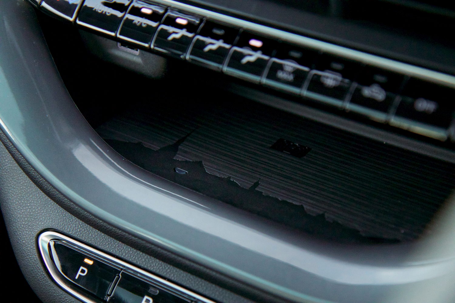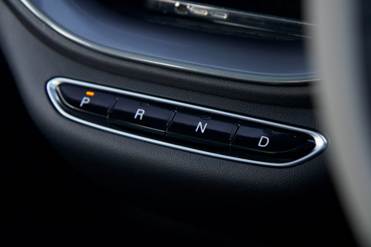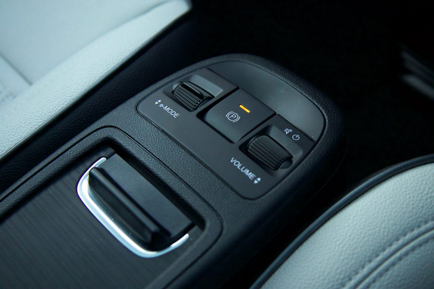 In the dash centre is a row of buttons with which you select Drive, Reverse, Neutral, or Park and the car's systems power-up once you prod a starter button on the dash. Between the seats, the centre console juts outward into the cabin, and at the edge of that jut there are rotary switches for stereo volume and driving mode selection, plus the switch for the electronic parking brake.