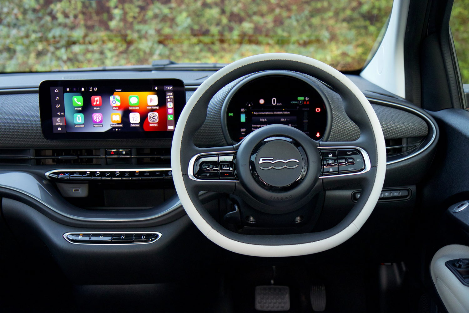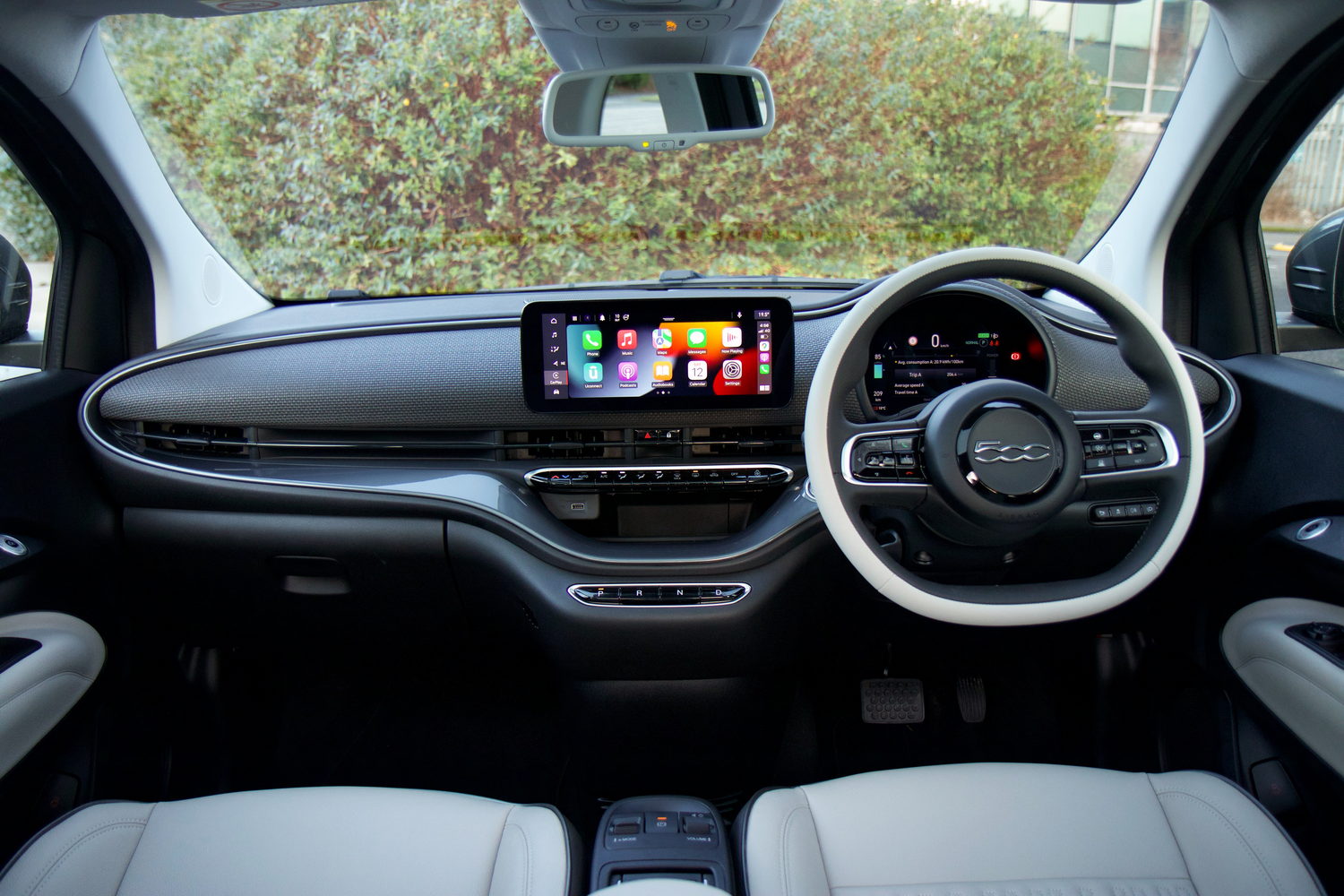 One particularly good thing about the 500e's cabin is the driving position. The petrol 500 always had something of a barstool feeling to its front seats, leaving you feeling perched-up and rather uncomfortable on a longer journey. The 500e's seats are much better - you're still sitting quite upright, but the seats are broader and deeper, and so you feel better supported and much more comfortable. If you've not gone for the soft 'eco-leather' of the La Prima, then you'll get a seat fabric made from recycled, recovered ocean plastics called 'Seaquel.' It's a nice touch.