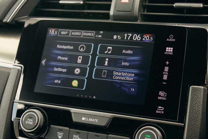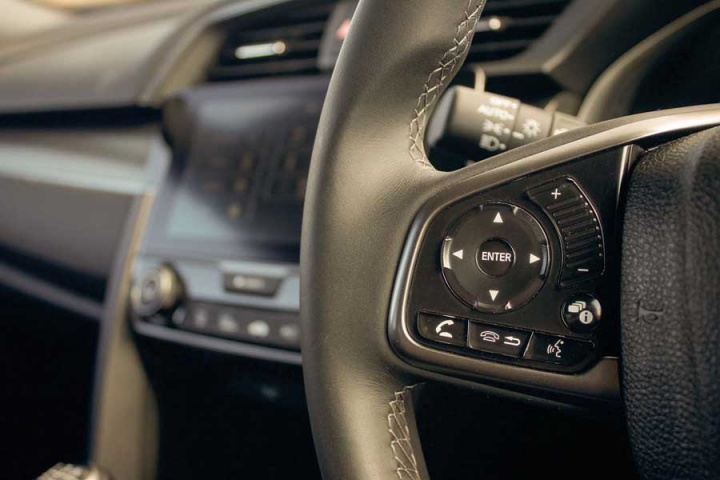 We were driving a high-spec Premium model, so that means you get the seven-inch Honda Connect infotainment system, whose menu and graphical layout isn't the slickest, but it does come with Apple CarPlay and Android Auto, so you won't have to interact with the car's own system too much. More significantly, all new Civics come with the Honda Sensing safety package, which includes autonomous emergency braking, lane keeping assistant, 'Road Departure Mitigation' (which can actually brake to stop you running off the tarmac), radar-guided cruise control, traffic sign recognition and, as options, a blind spot monitor, rear crossing traffic alert and a 180-degree reversing camera. It's a comprehensive set of safety kit and Honda is to be commended for making most of it standard fit.