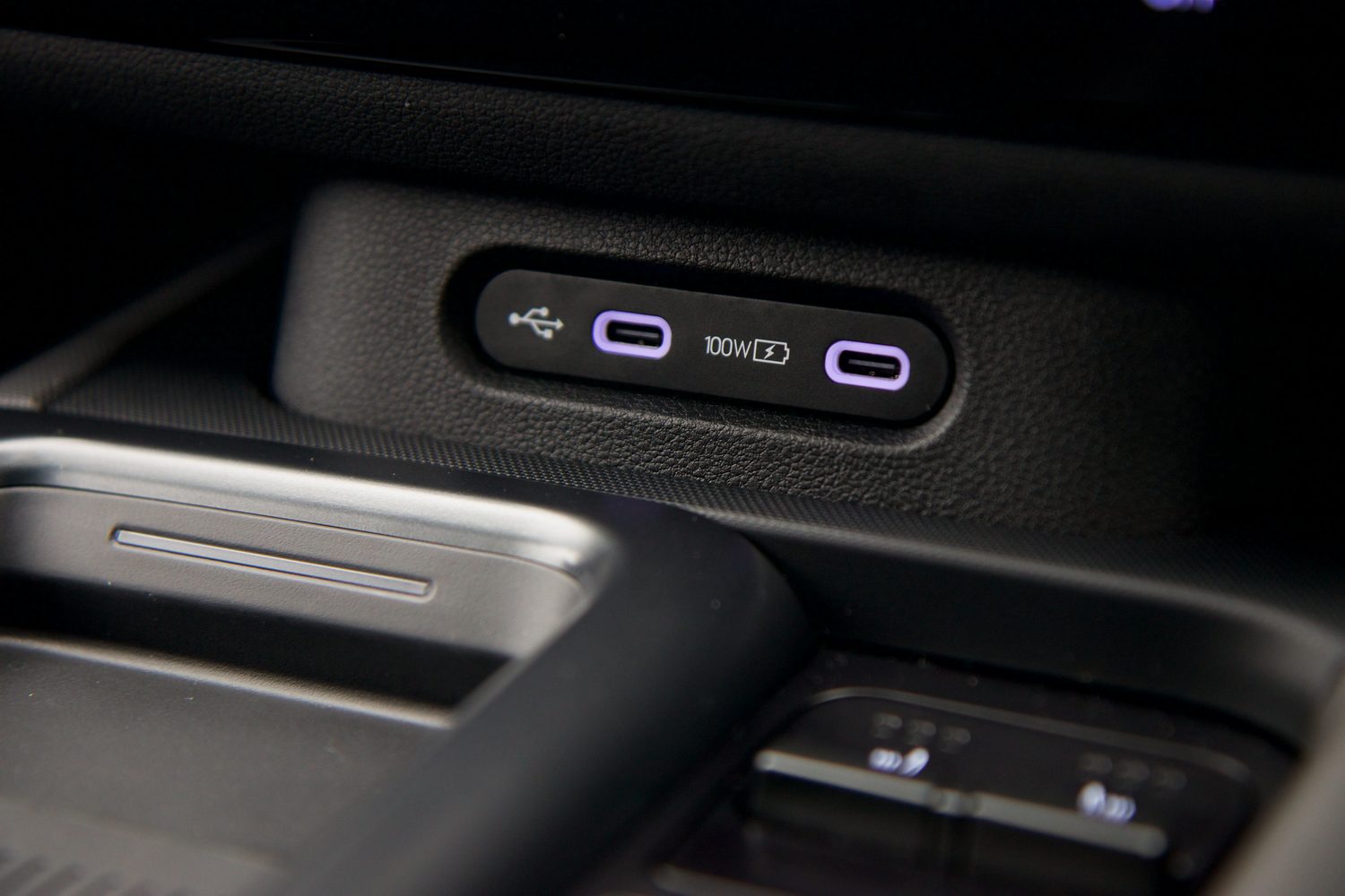On the centre console sits a rubberised wireless charging pad, for instance, and we really like how the rear of this section curves down to naturally hold a phone at an angle when it's not being charged. There are two USB-C ports ahead of that, one of them rated to 100W, and another two at the back of the centre console for rear passengers to access.
