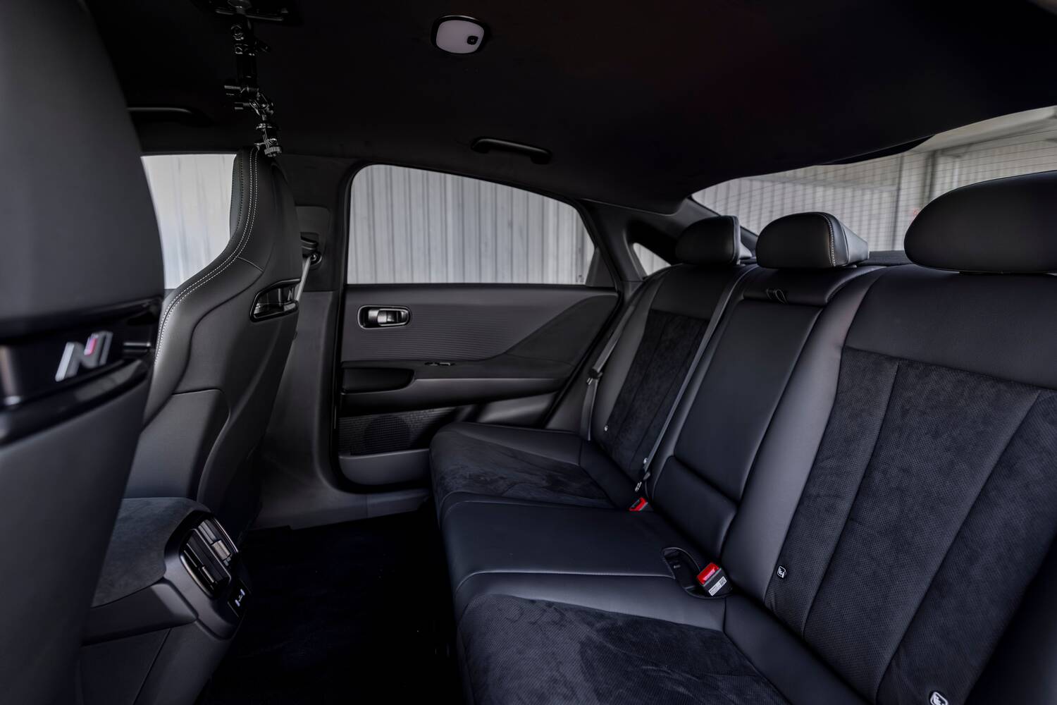 It may be a driver's car, but the Ioniq 6 N's lengthy wheelbase means there's a surprising amount of rear passenger legroom. Headroom fares reasonably well, too, given the car's sloping roofline, and a completely flat floor means the middle occupant has room for their feet as well.