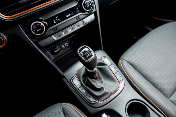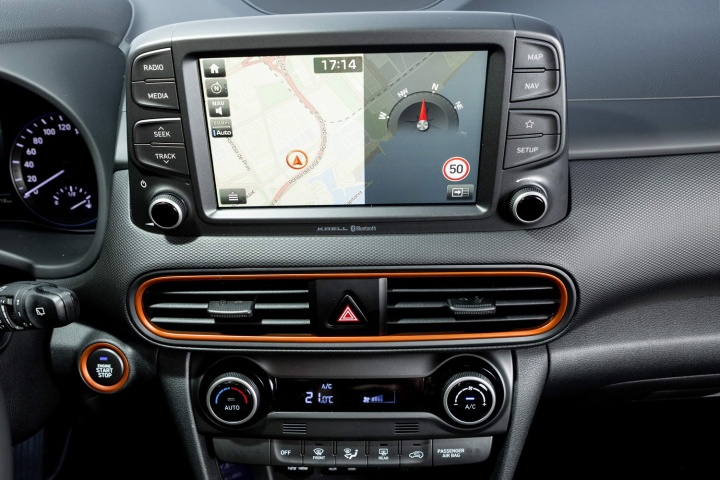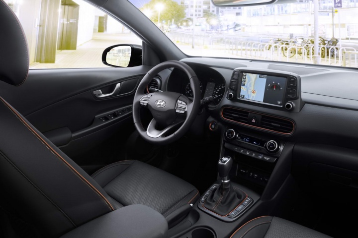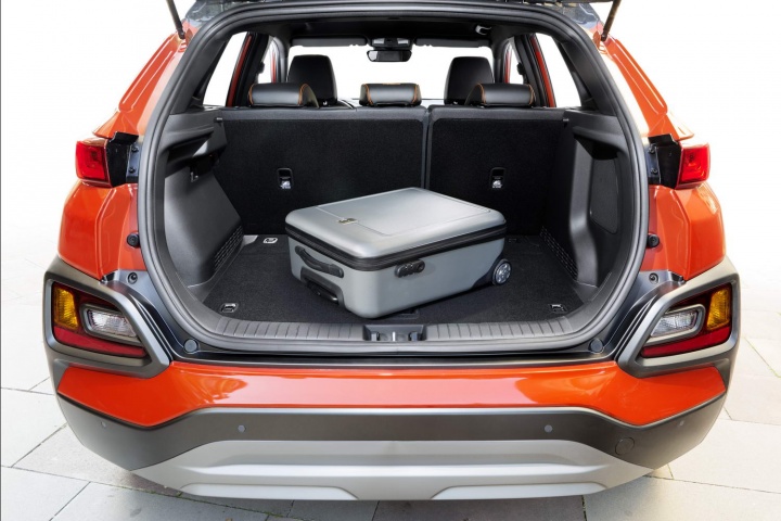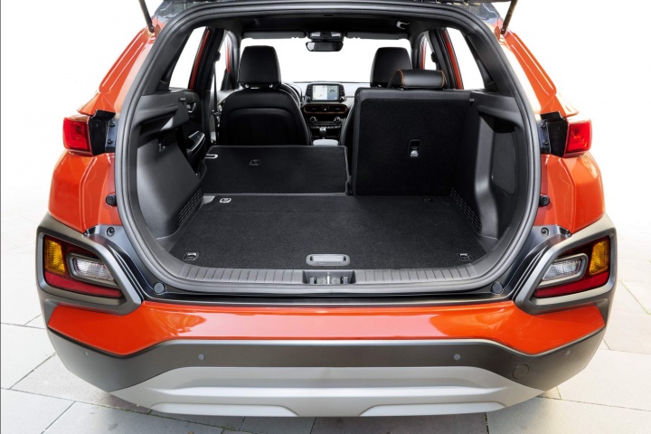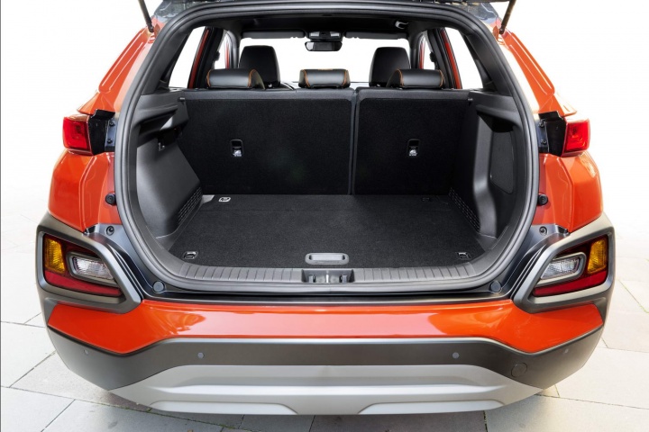 The interior is more conventional. Sure, you can colour-code it to the exterior by choosing a colour for the seatbelts, air vent surrounds, contrast stitching and more, but overall it's quite black and relatively conservative, in line with most of Hyundai's offerings. It's worth noting, too, that the Hyundai i30, for example, has more touchy-feely plastics than the Kona, which is a sign of the cutthroat segment it competes in more than anything else. Nonetheless, The Kona's cabin is modern and can be equipped with all the latest touchscreen infotainment and connectivity technology. It's decently spacious too, if not class-leading. Rear headroom is generous and four adults of average size will have no issues fitting comfortably in. A fifth will feel a little perched up high in the middle of the back seat, but that's to be expected. Unlike the Citroen C3 Aircross, the Kona's rear bench cannot slide to allow you prioritise boot space over legroom or vice versa, which is a shame. The seat back splits and folds flat with the boot floor, however, and at 361 litres that luggage space isn't top of the segment but it is of use.