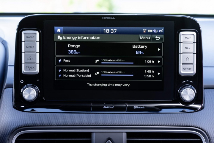 Officially, this 64kWh model will cover up to 449 kilometres between charges according to the more realistic WLTP test. Even accounting for real-world use during colder winter months, we still expect the Hyundai to deliver an impressive driving range per charge. If you could find a 100kW DC fast charger (and had it all to yourself), the Kona Electric is said to charge up to 80 per cent capacity in 54 minutes. Otherwise, its 7.2kW onboard charger will take 9 hours 35 minutes to charge for the 64kWh model, plugged into the mains, with the 39.2kWh variant taking 6 hours and 10 minutes on a similar charge. Unlike the Ioniq Electric, the Kona Electric has a liquid cooling system for the battery to keep it in a more stable condition. For colder climates, it also has a battery heating system.