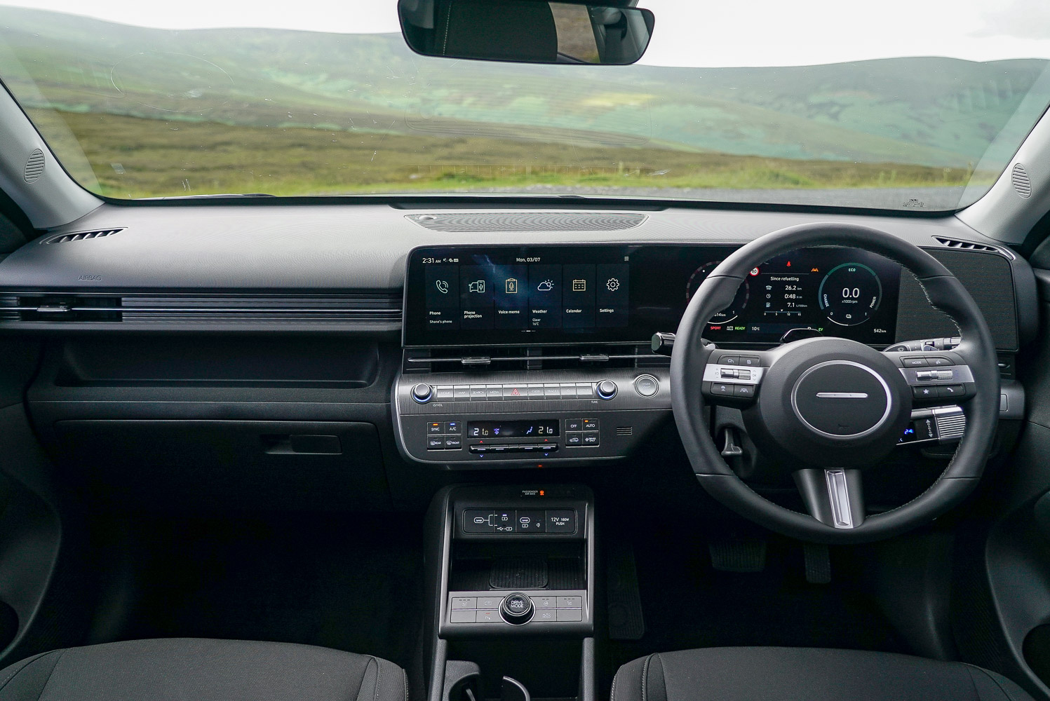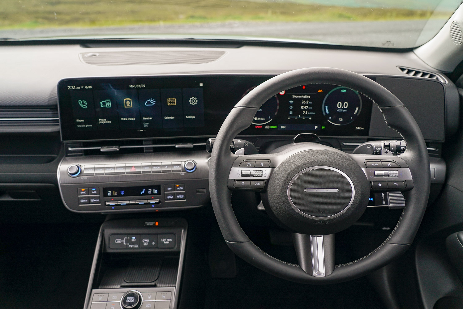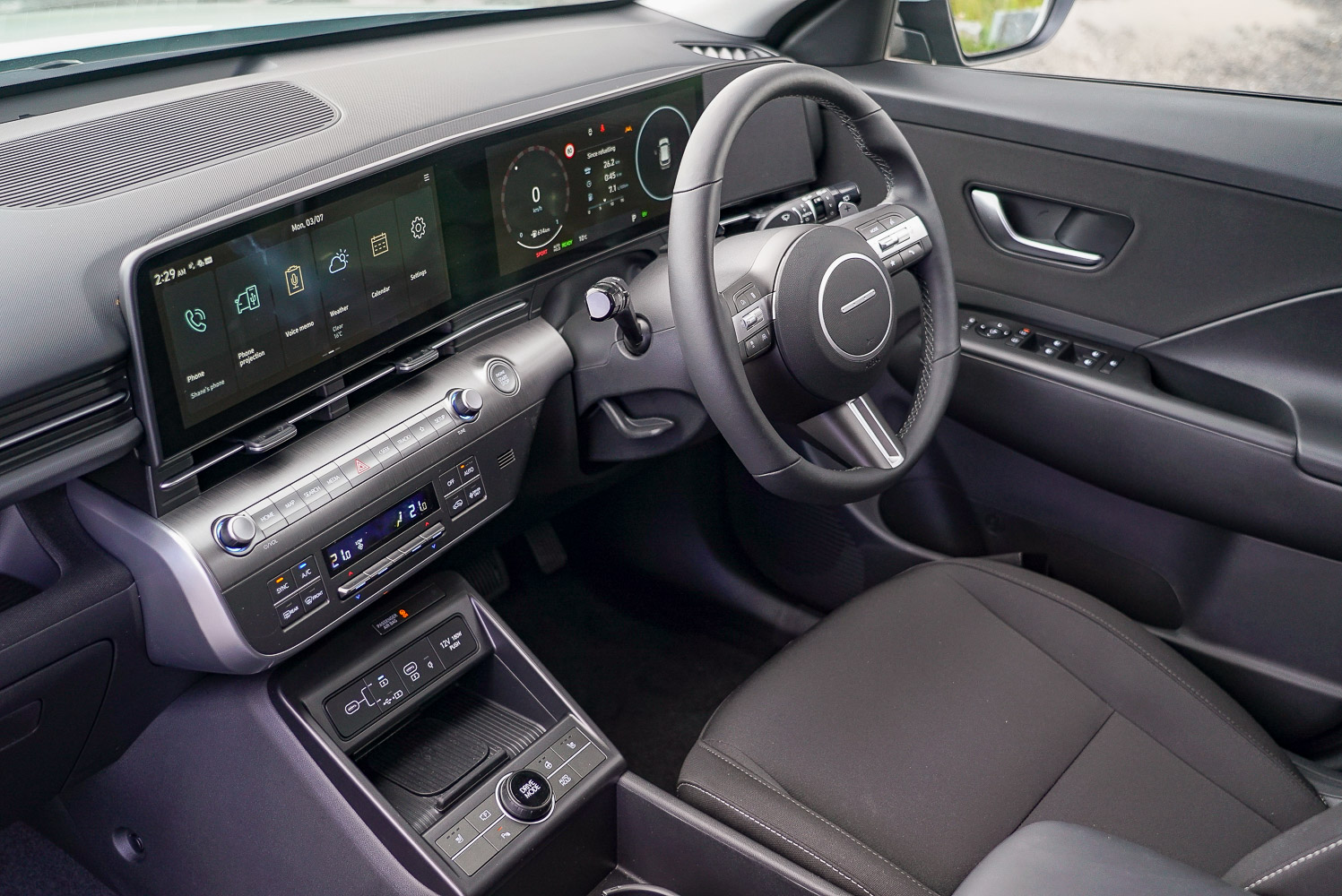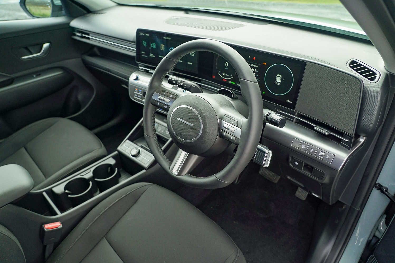 Up front, though there are hints of the old Kona in terms of the layout and switchgear, all is new. It isn't just a direct copy from the Hyundai Ioniq 5/6, either, though some inspiration has been taken from those EVs. For example, the tactile leather steering wheel doesn't have any Hyundai logo on it and while it looks unusually sculpted, it is good to hold and not too thick of rim, either. Behind it in the hybrid model is a set of plastic gearchange paddles for the dual-clutch automatic gearbox, but we found little reason to use them.