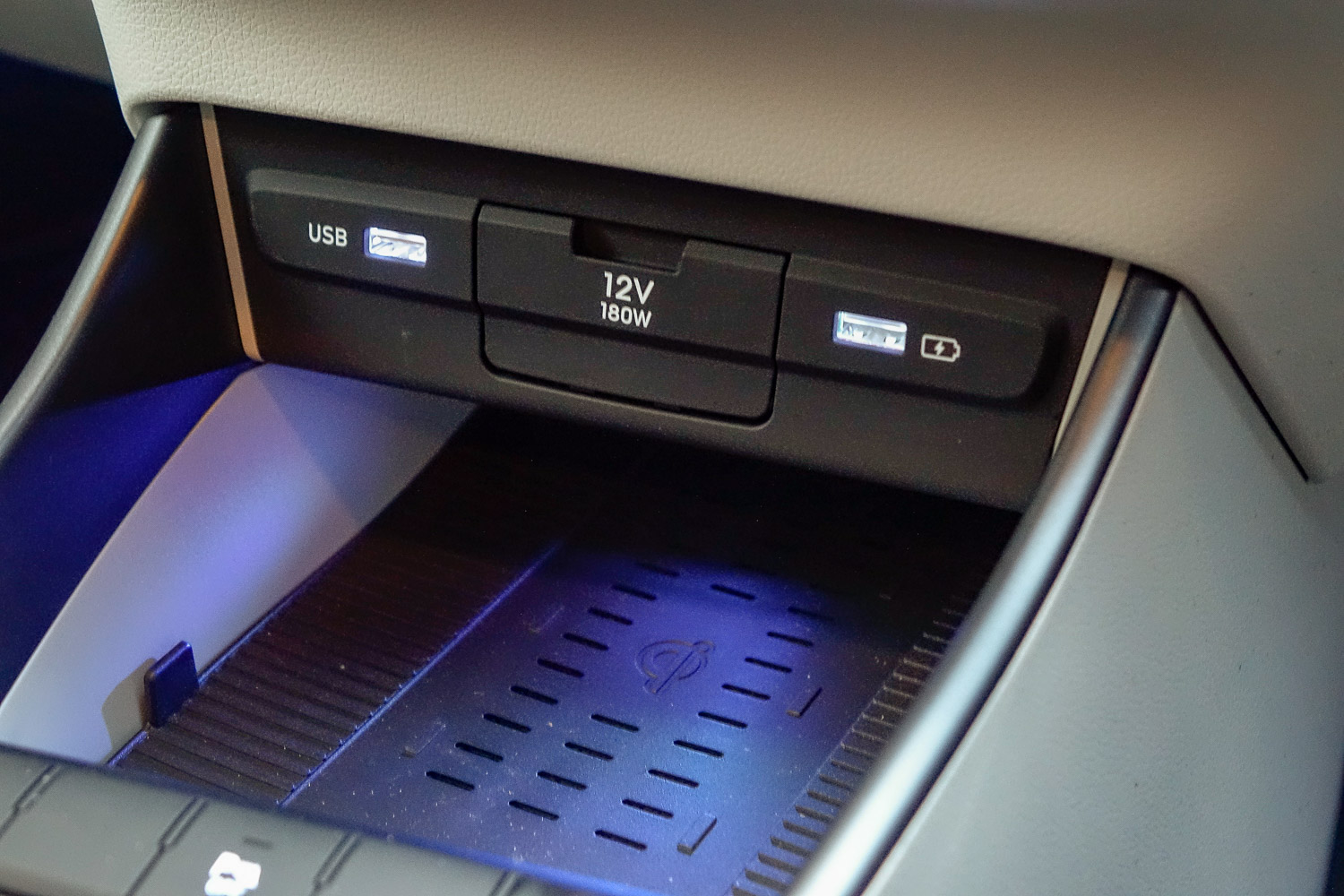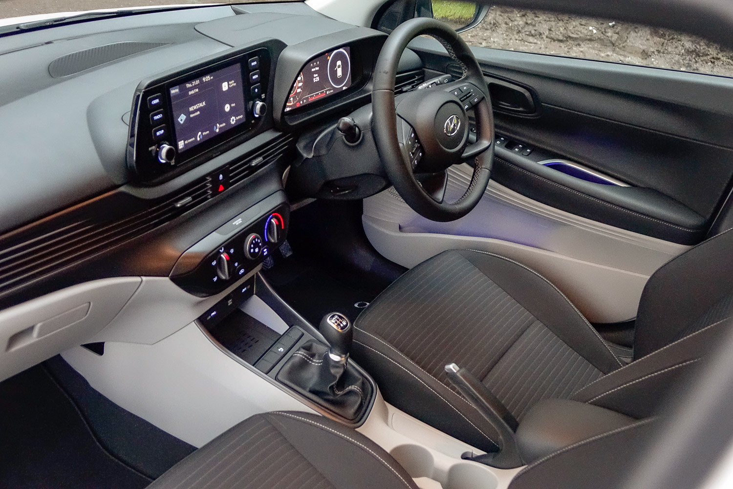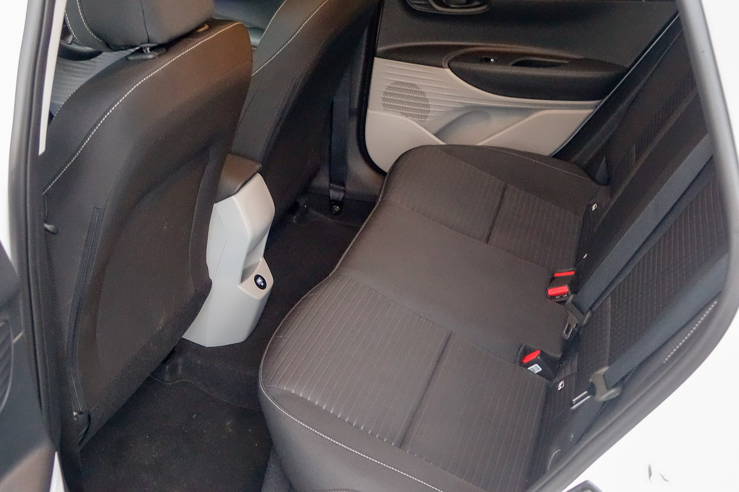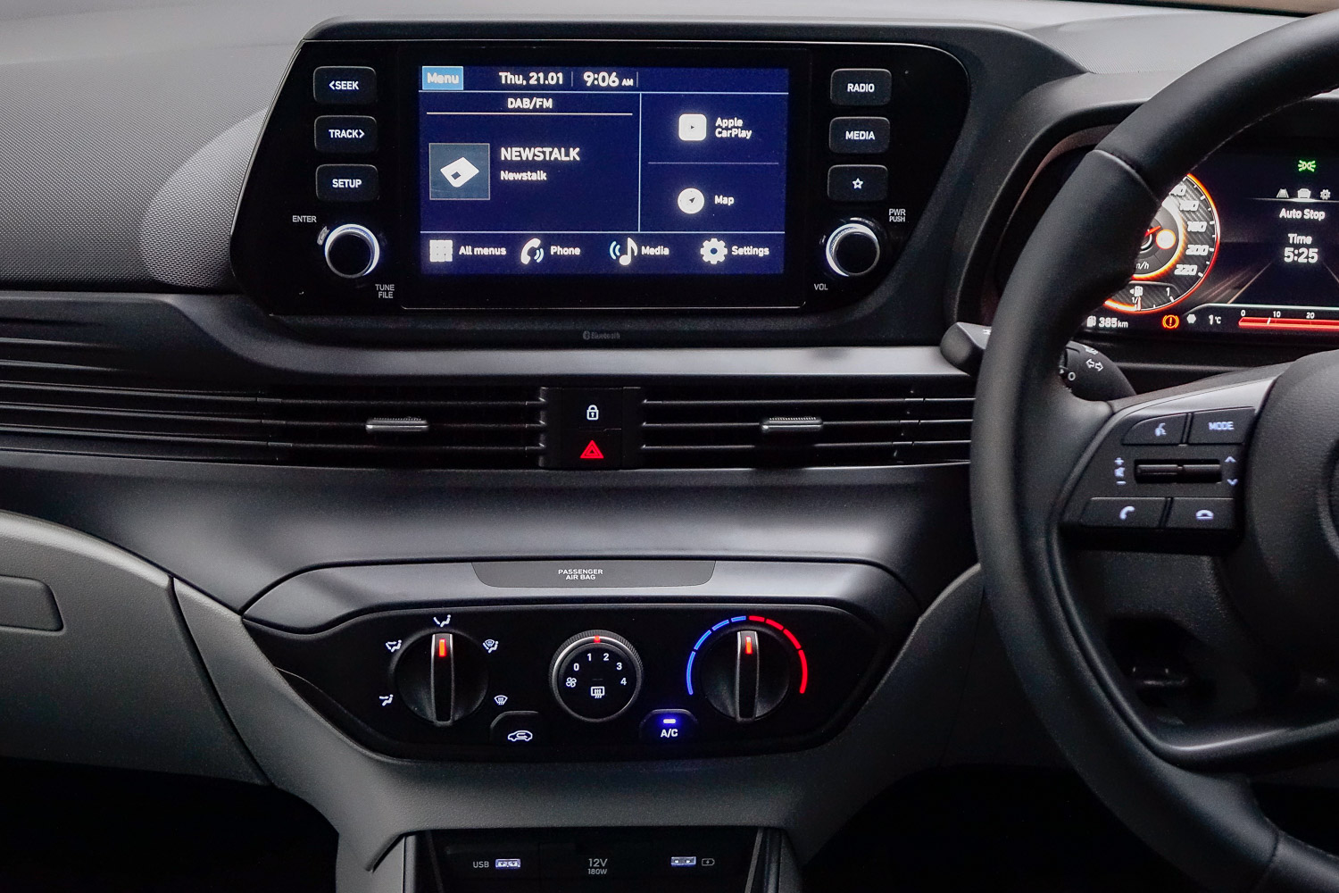 In terms of interior design, a straked motif dominates, helping to break up the plastic surfaces and giving the i20's cabin a unique appearance. This runs across the dashboard, integrating with the air vents, and into the two-tone door cards. Meanwhile, there's digital instrumentation, similar to that used in the new Hyundai Tucson, and a good touchscreen infotainment system mounted at the same height. We're glad to see it come with physical shortcut buttons, while the air conditioning is operated by traditional rotary dials, which we also approve of. Under that, there's a useful storage area featuring the wireless charge pad, two USB ports and a 12-volt charge point. Another USB port sits in the middle of the rear.
