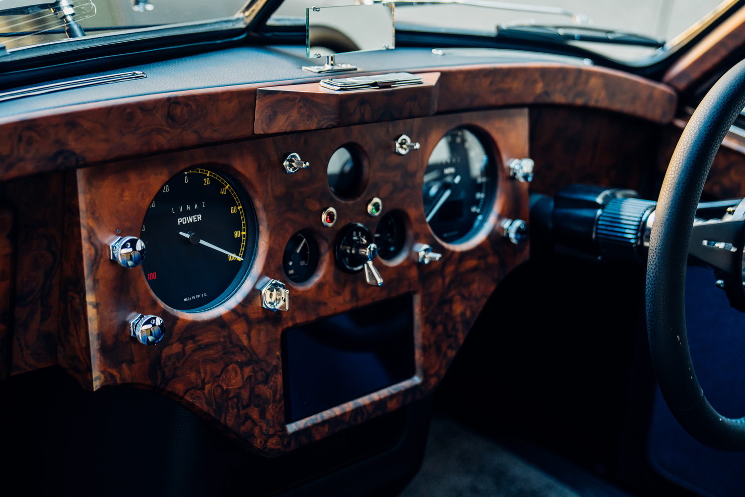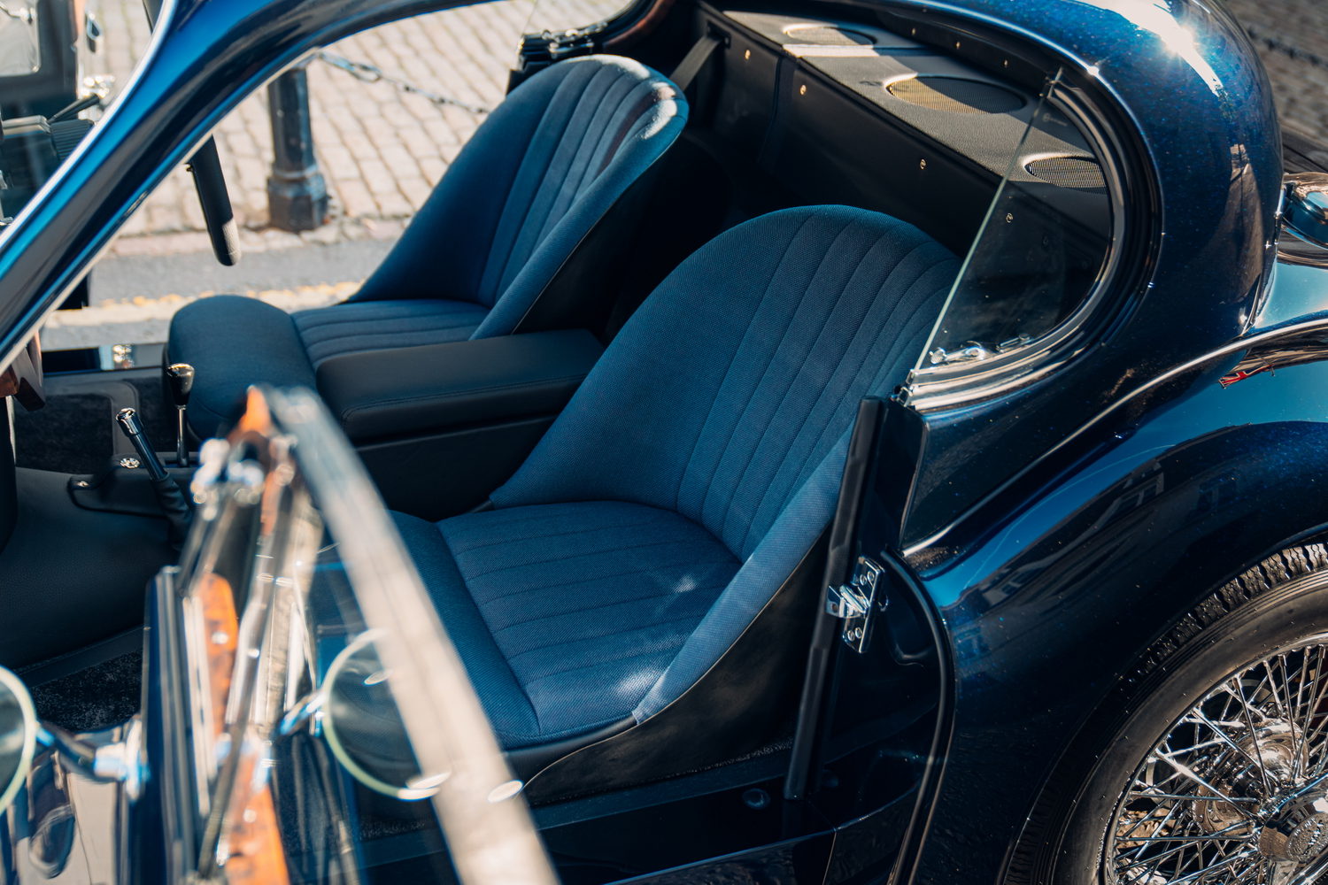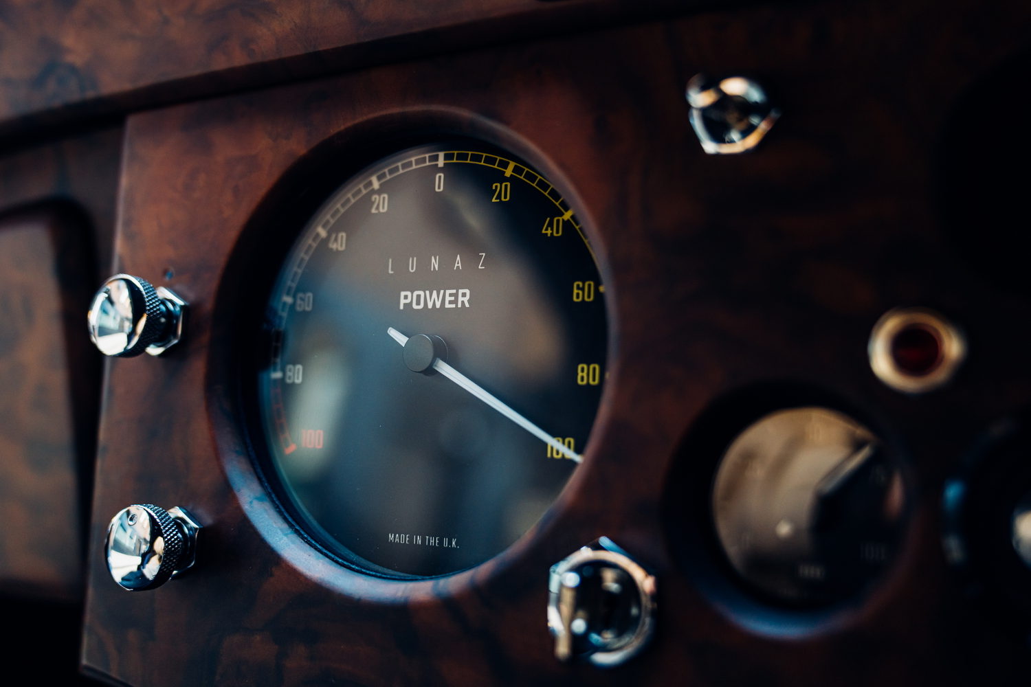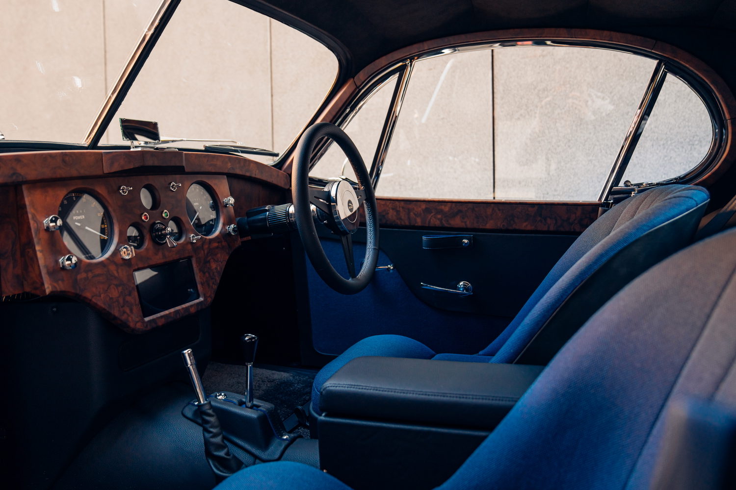 As a result, every car is unique, but they all look more or less in keeping with the original. The XK120 we drove came in a gorgeous shade of dark metallic blue, complete with wire wheels and chrome exterior trim. At a glance, it could have been a pristine, completely original XK120. At least from a distance. Look closely, though, and you would spot the subtle Lunaz logos designed to look like club or rally badges, and the modern disc brakes lurking behind the wheels.