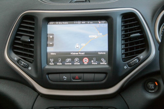 The interior is much simpler - it's nice. The big shiny screen of the Uconnect satnav and infotainment system looks well slapped up there in the middle of the dash, there are lots of chunky buttons everywhere and an appealingly muscular-looking steering wheel. Rammed to the gills with equipment, including wonderfully comfy eight-way power adjusted leather-clad heated and cooled seats (THIS is why I love American cars!) the Cherokee felt like a nice place in which to sit.