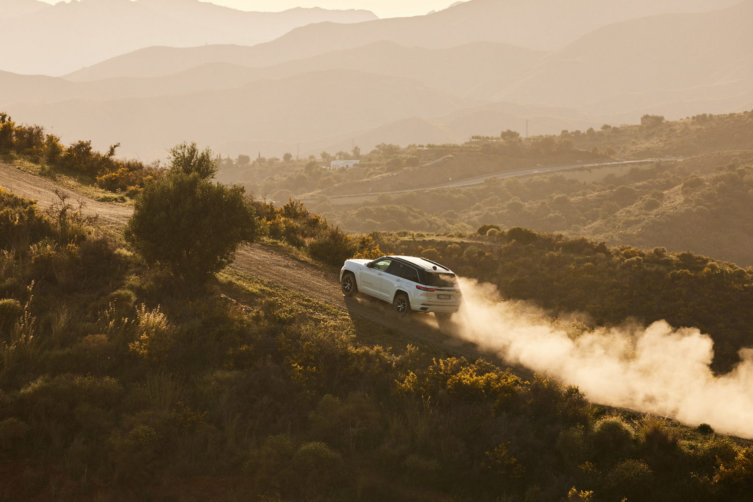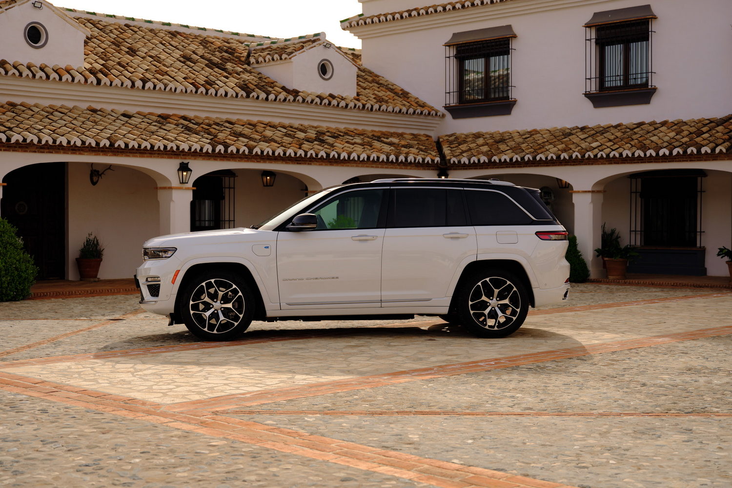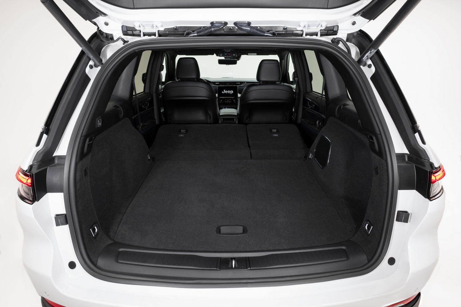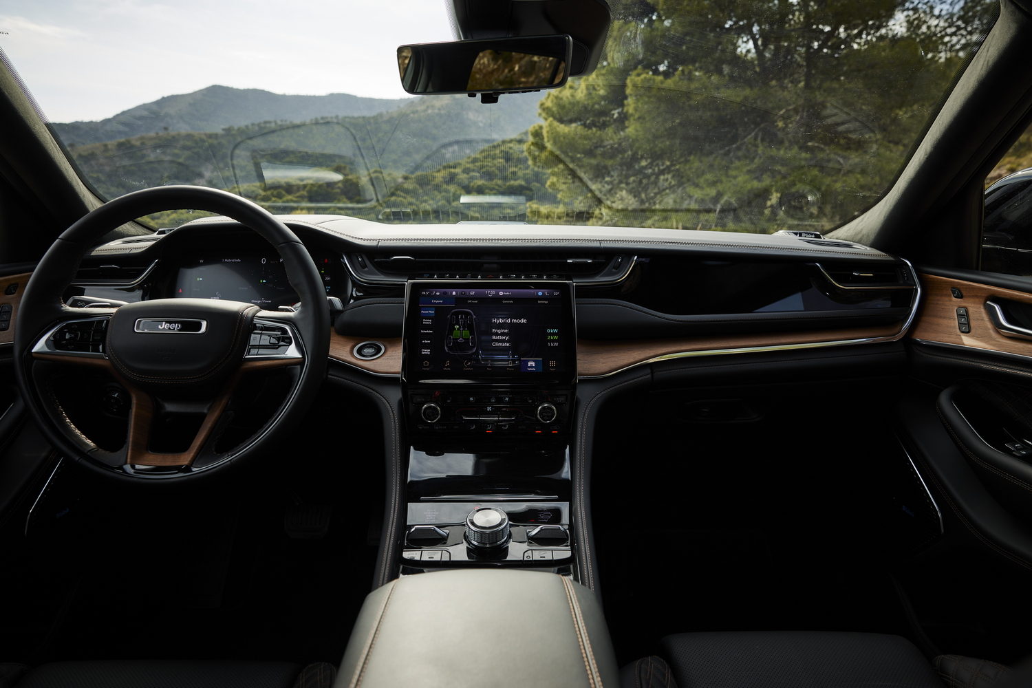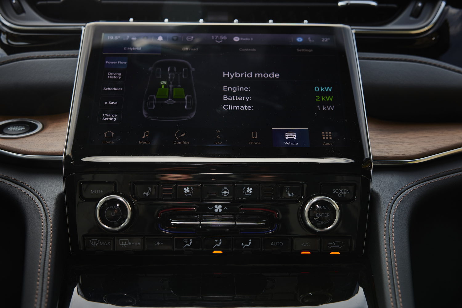 The Grand Cherokee arrives with a 17kWh battery, an electric range of 48km and a four-cylinder turbocharged petrol engine, a technical specification that doesn't quite match that of the Range Rover Sport, for example. The Range Rover also has more power - 440hp plays 380hp - but the Jeep does pull ahead on torque, at 637Nm.