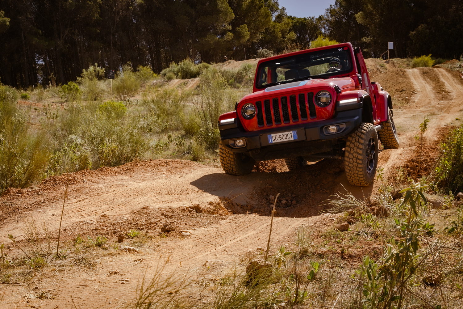 Technical section done, we head out onto a longer gravel-and-dirt trail that winds between trees and up and down large hills. Now we're in hybrid mode, and the Wrangler feels very lively indeed. Torque is limited in low gears, to the benefit of control when you're tackling tricky sections, but if you can find enough room to get it into third, the Wrangler 4xe rockets forward - it's almost viciously quick at times, a sensation enhanced by the fact that you're unencumbered by bodywork. That Jurassic Park T-Rex wouldn't have got near this Wrangler...