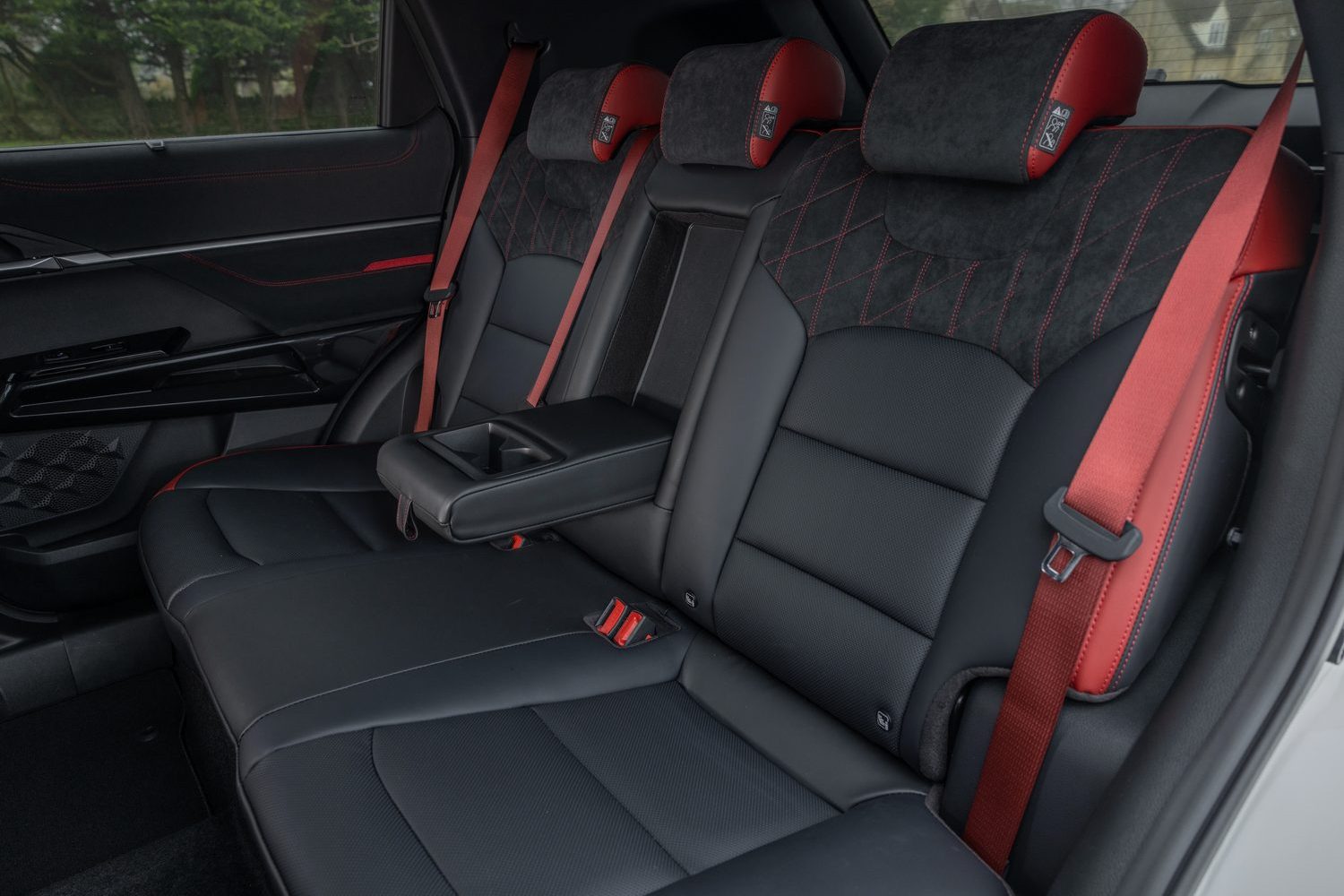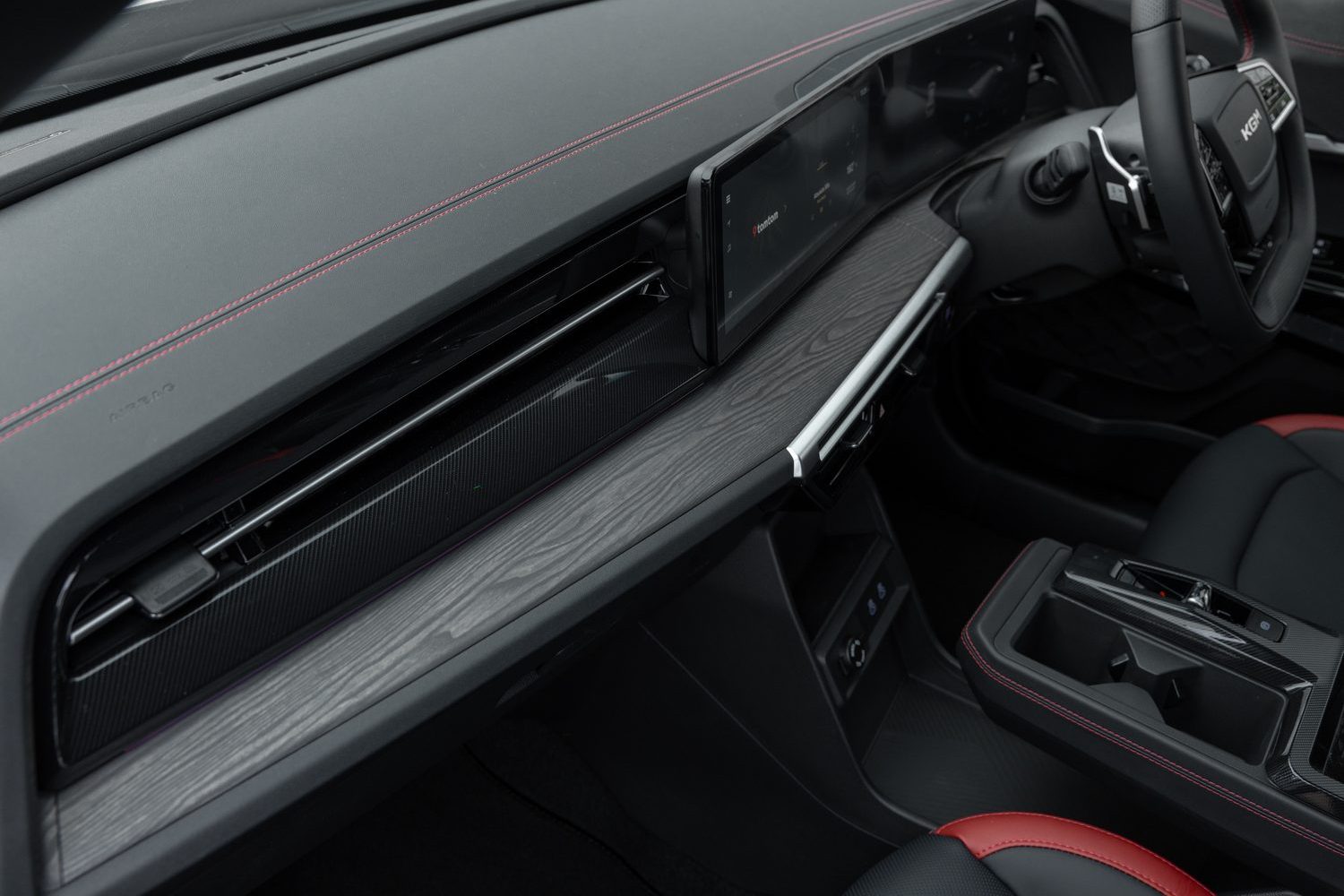 The dashboard is dominated by a pair of 12.3-inch digital screens, more on which in a moment. These sit above a broad strip of wood trim, which looks nice, but which includes an ugly and somewhat ham-fisted join as it crosses behind the steering wheel. That’s made up for by a soft, almost suede-like material on the upper dash and the tops of the doors, while the seats get Nappa leather with contrast red stitching and some quilted panels. They’re comfortable and really lift the ambience of the cabin.
