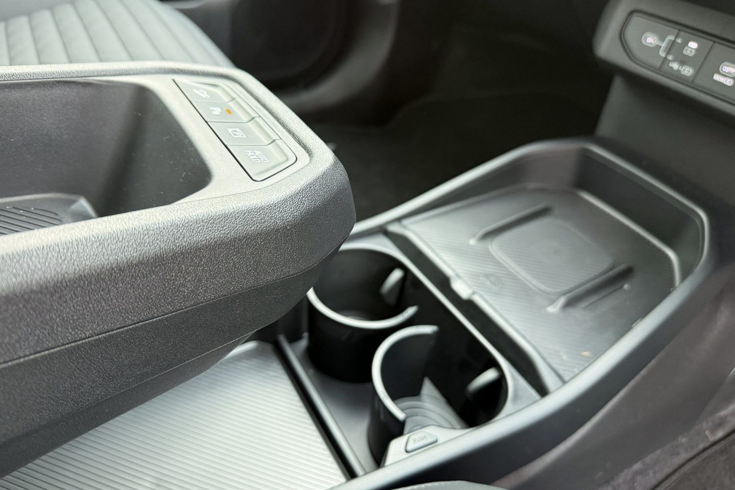 There's lots of space in the front of the EV4, with copious headroom and legroom even with the GT-line's glass sunroof. There are good storage options too, with a large open space in lieu of a centre console, which features that wireless phone charger, plus two cupholders, the arms of which rotate out of the way if you need more flat storage.