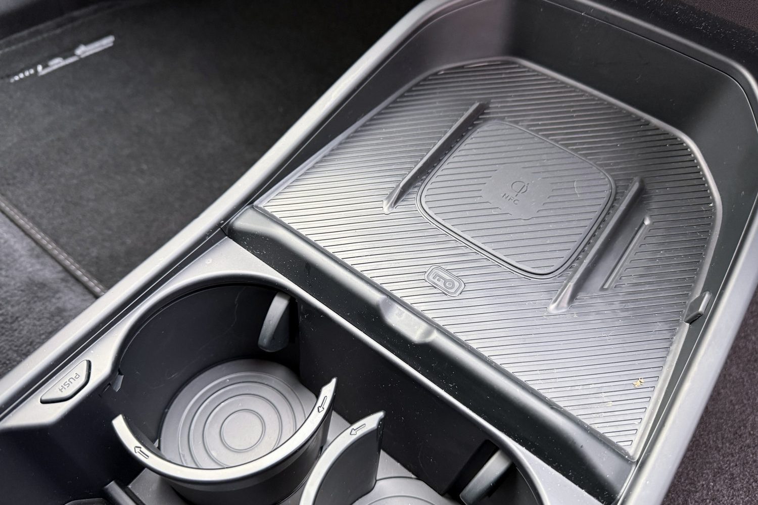 Lower down in the front, there's a set of two USB-C ports, one of which is a powerful 100-watt socket which will charge a laptop or tablet, and there's a 12-volt outlet behind a flap. There's also a handy wireless phone-charging pad.