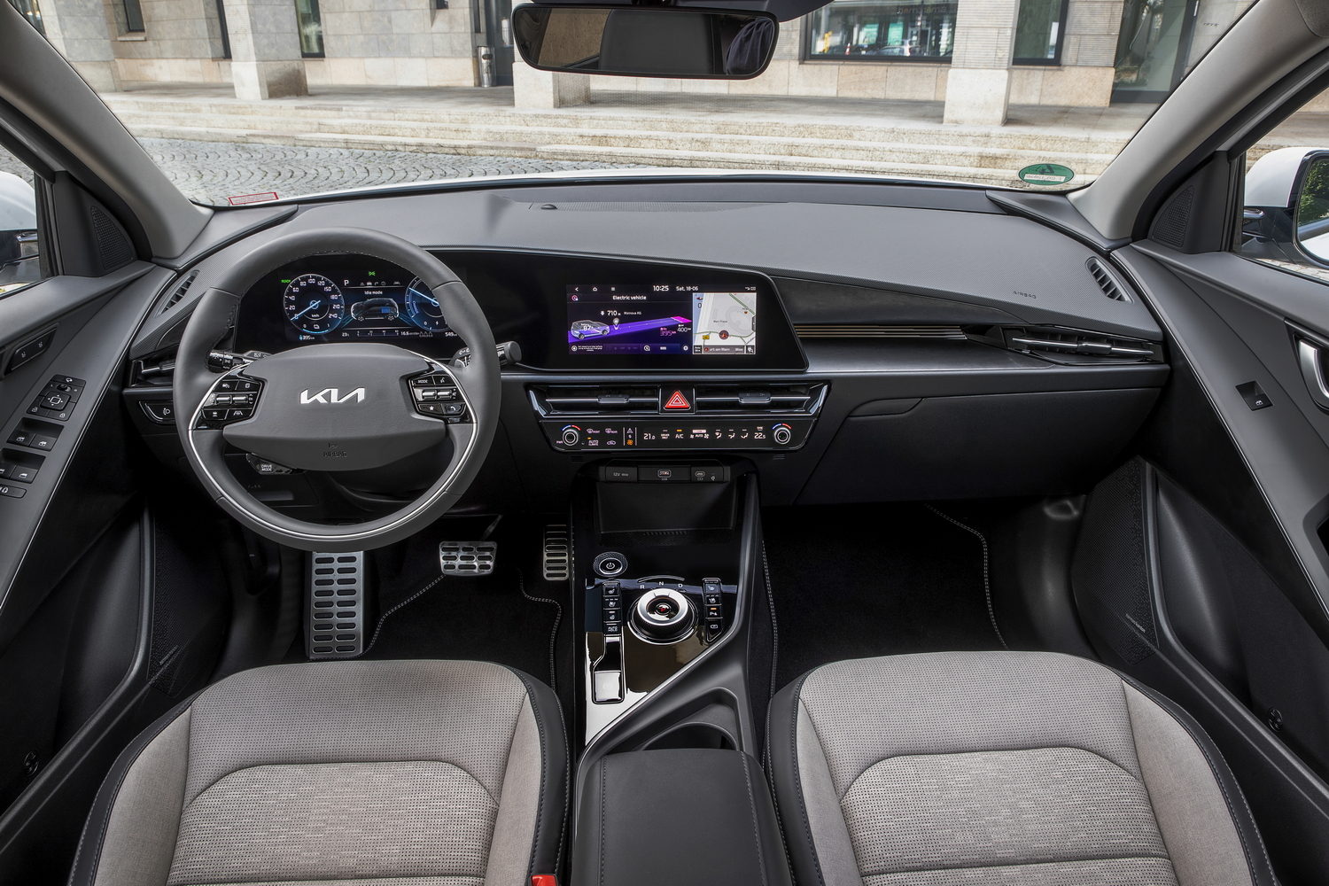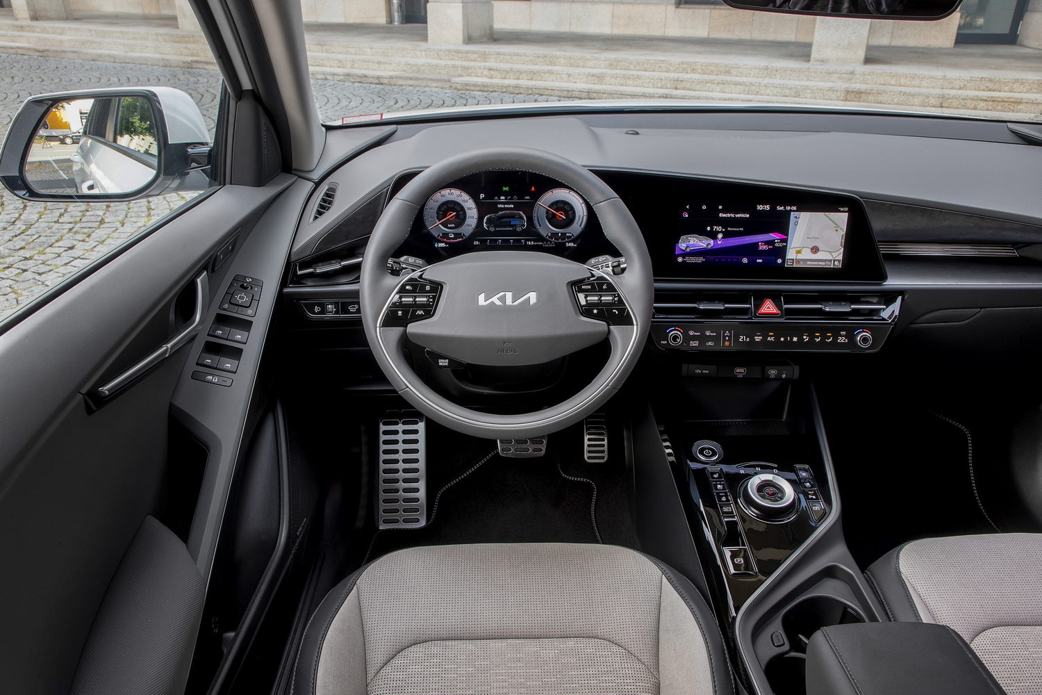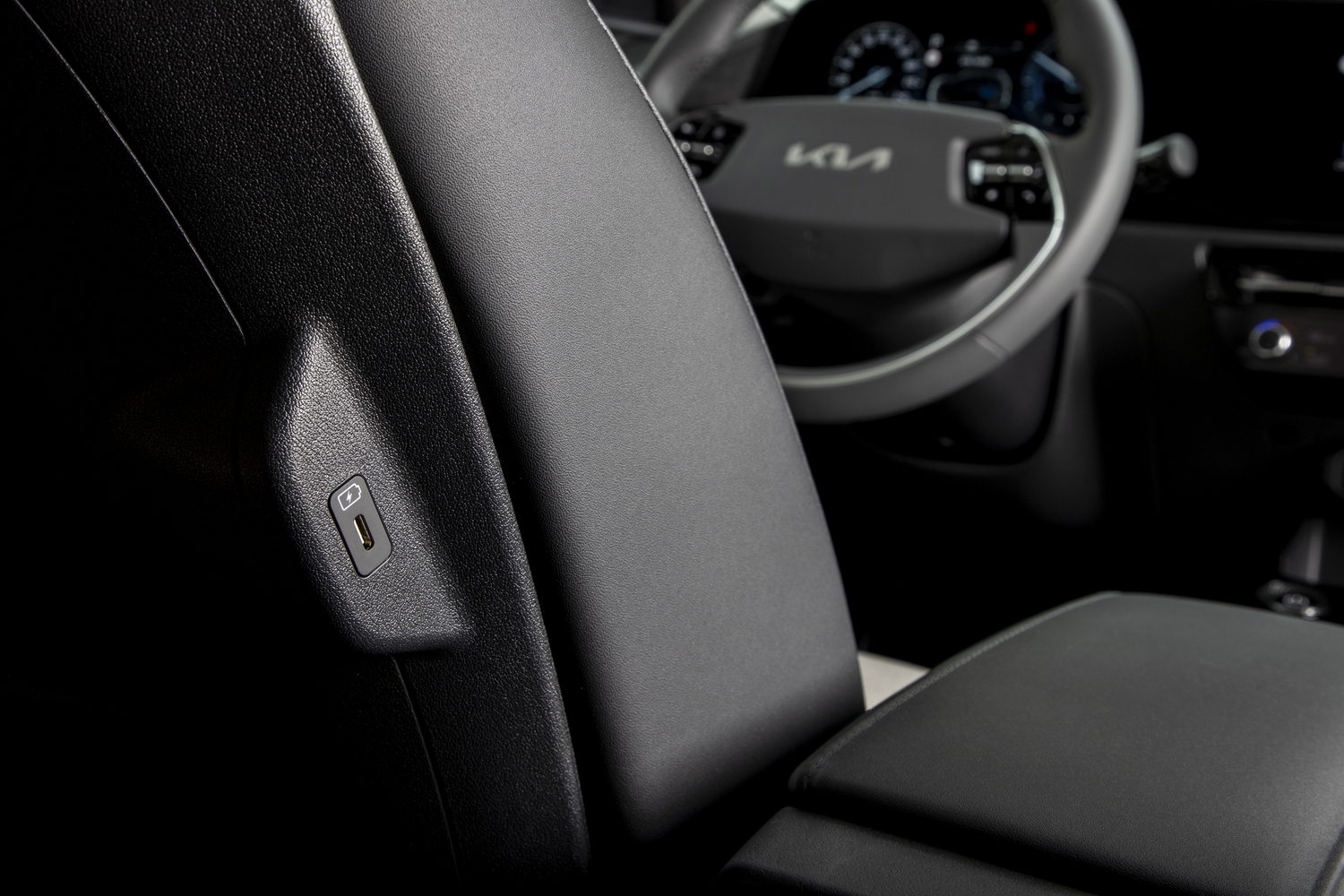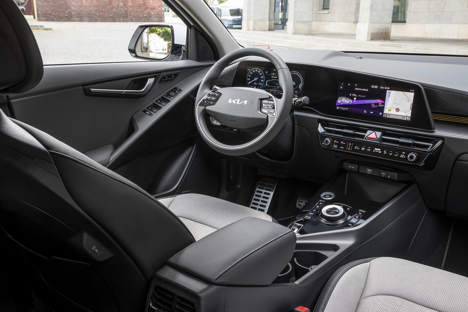 Aside from that, it's hard to find many faults - particularly with the Niro EV's interior. Taking inspiration from the Kia EV6, the dashboard is as forward-thinking as the exterior, with big screens and a rotary gear selector. The steering wheel's a bit ugly, but generally the cabin looks great, with a massive central touchscreen and a digital instrument display for the driver.