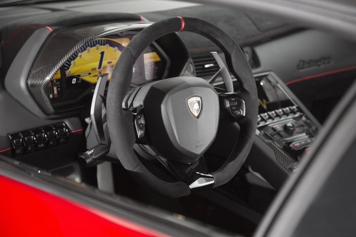 Lamborghini chose to emphasise the Aventador's carbon fibre construction in the SV's interior design too, so the chassis underneath is more obvious and a soft new material called 'Carbon Skin' is employed for the first time, while the new seats have carbon fibre shells - plus a mix of Alcantara and leather for the upholstery. The instrumentation is also completely new, featuring a large TFT screen and even a G-force meter.