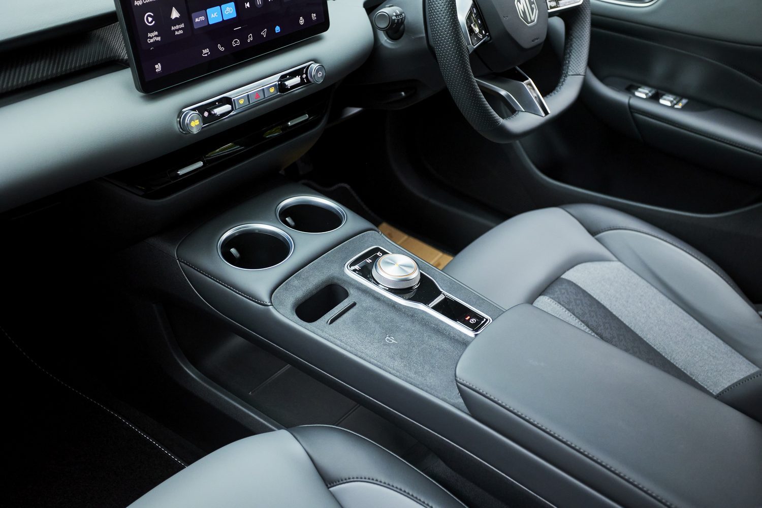 The floating construct in the centre of the MG4 creates a better location for the smartphone charging pad, plus a couple of handy cupholders, though it does then create an under-dash area.