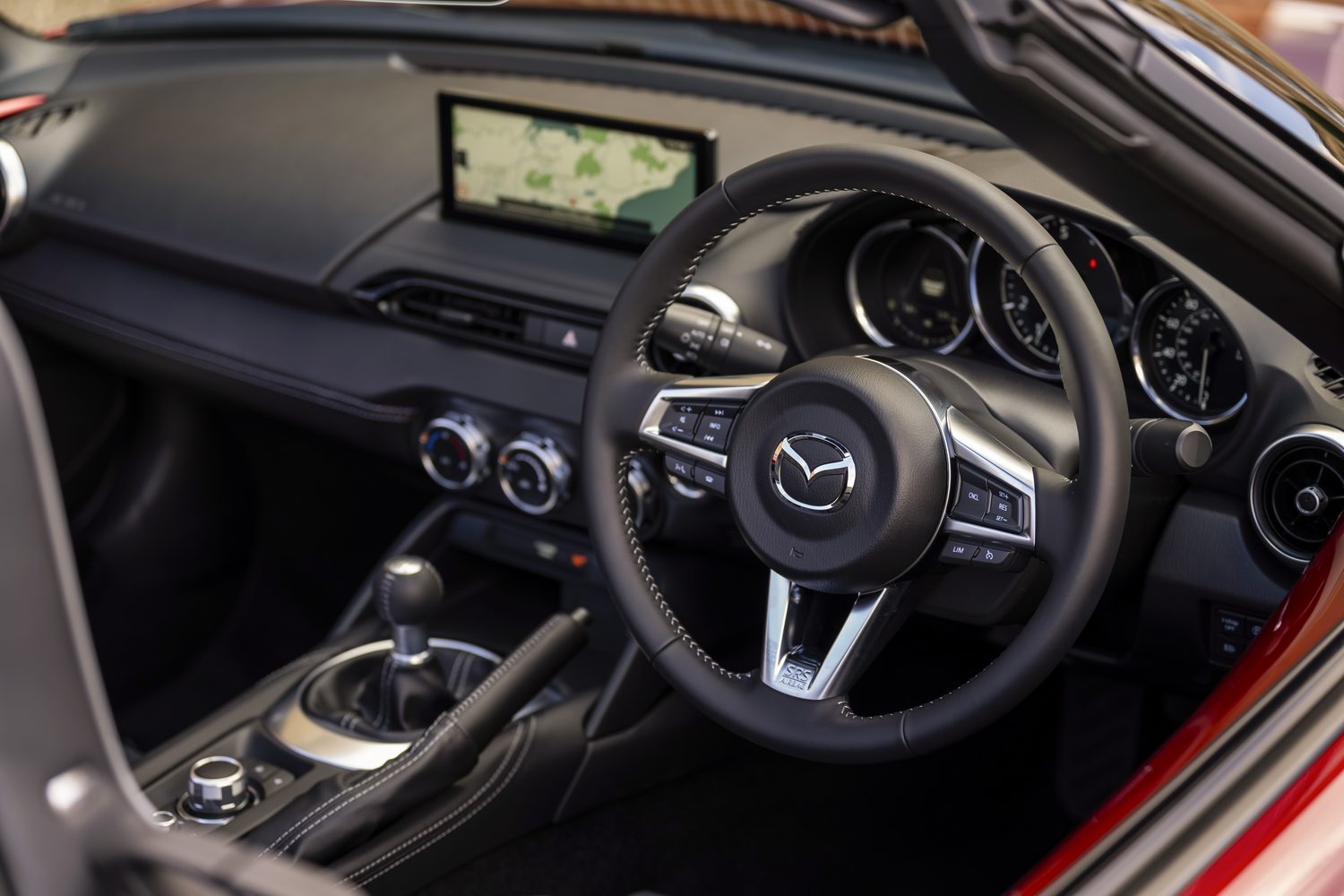 Mazda Ireland sells the MX-5 only in one trim, called Exclusive-Line. That comes with 16-inch alloy wheels, leather upholstery, a new frameless auto-dimming interior mirror, a nine-speaker Bose sound system, LED lights and the upgraded infotainment system as standard (among much more), all for €39,890 for this 1.5 Roadster.