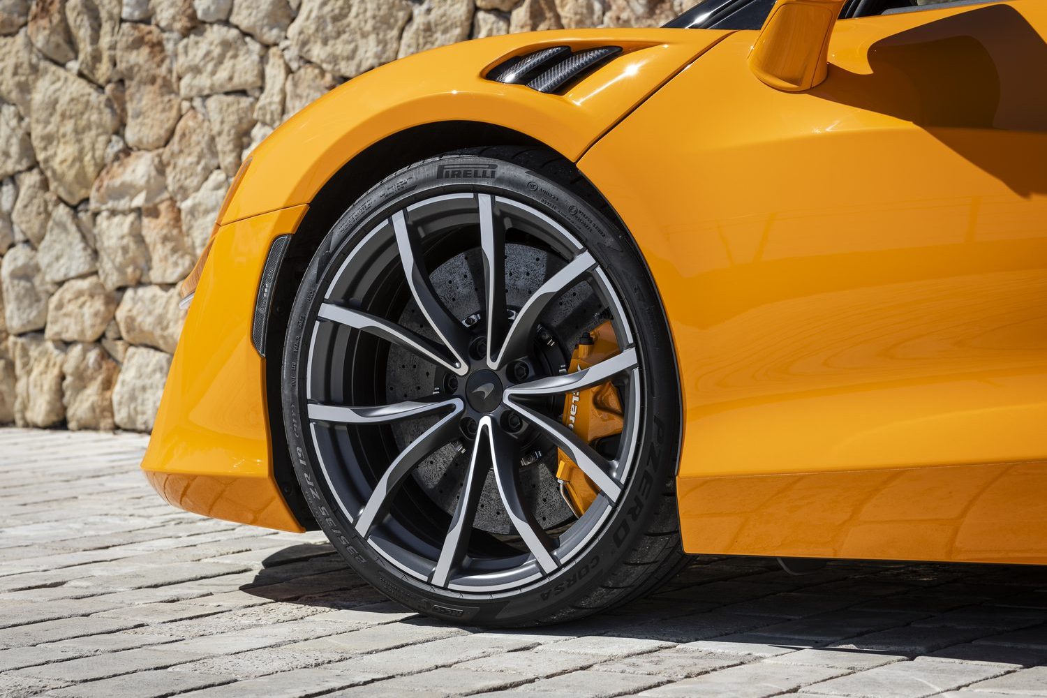 Sitting on a gorgeous set of ten-spoke, super-lightweight, 'Star' design forged alloy wheels in a Dark Stealth diamond-cut, and with McLaren Orange brake callipers peeping out from behind them, this is a machine which can stop all traffic within a 100-metre radius of its position with consummate ease.