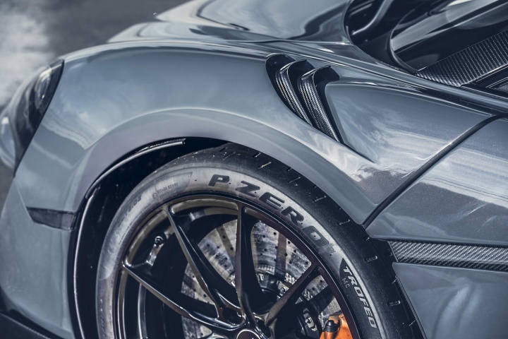 Finished in a dark hue, the McLaren 600LT is a menacing presence, yet one that's relatively subtle given its performance. The exterior changes over the 570S Coupe it's based upon focus on its aerodynamics for the most part, so there's a long front splitter and large rear spoiler, a serious looking rear diffuser and a flat carbon fibre floor underneath, along with other carbon body parts designed to enhance engine cooling and the aerodynamics. It lives up to its 'Longtail' billing thanks to an extra 74mm in the length and the net result is a quoted 100kg of downforce at 250km/h. Ultra-light alloy wheels are standard, too, but the easiest way to spot a 600LT is from the rear, where you'll see that the exhaust outlets have been moved onto the rear deck, ahead of the new wing. They've made way for more aerodynamic tweaking beneath and are complemented by a new mesh to aid engine cooling.