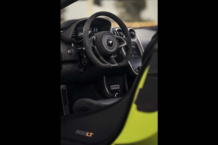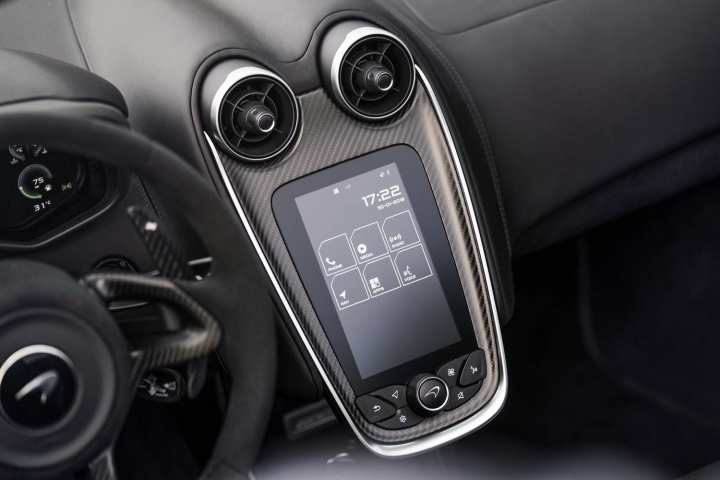 The interior is remarkably minimal looking, as there's no glovebox or door pockets and less padding and carpeting. As standard, a lightweight wiring harness is used and there's no satnav or audio or even air conditioning. Many buyers will add them back in (for no cost) and if they do, there's a portrait-orientated touchscreen that takes care of everything you need when required, complementing the crystal-clear digital instruments. Crucially, the driving controls are nigh-on perfect, with an Alcantara-trimmed steering wheel rim that isn't too chunky, firm pedals and proper gearchange paddles. You sit in the same carbon fibre racing seats as found in the McLaren P1 and, if your pockets are deep enough, you can swap them for the even lighter items used in the McLaren Senna. Or, if you don't share McLaren's obsession with weight reduction, there are heated and electrically adjustable sports seats available, too.